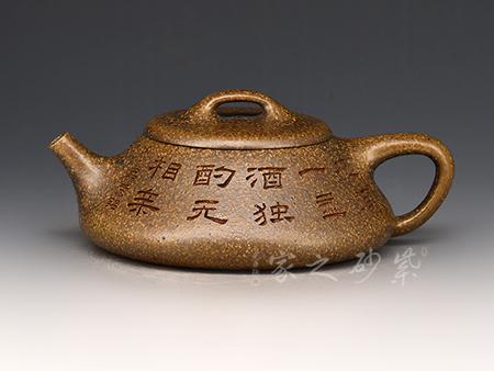 泥性:感甜嫩綿密,質(zhì)堅(jiān)而溫潤,呈近田黃色調(diào),為江蘇宜興趙莊山系朱泥礦~黃石黃之共生礦,經(jīng)挑揀練製而成,因含鐵量只達(dá)6%左右,致陶之后呈“金田黃色”。