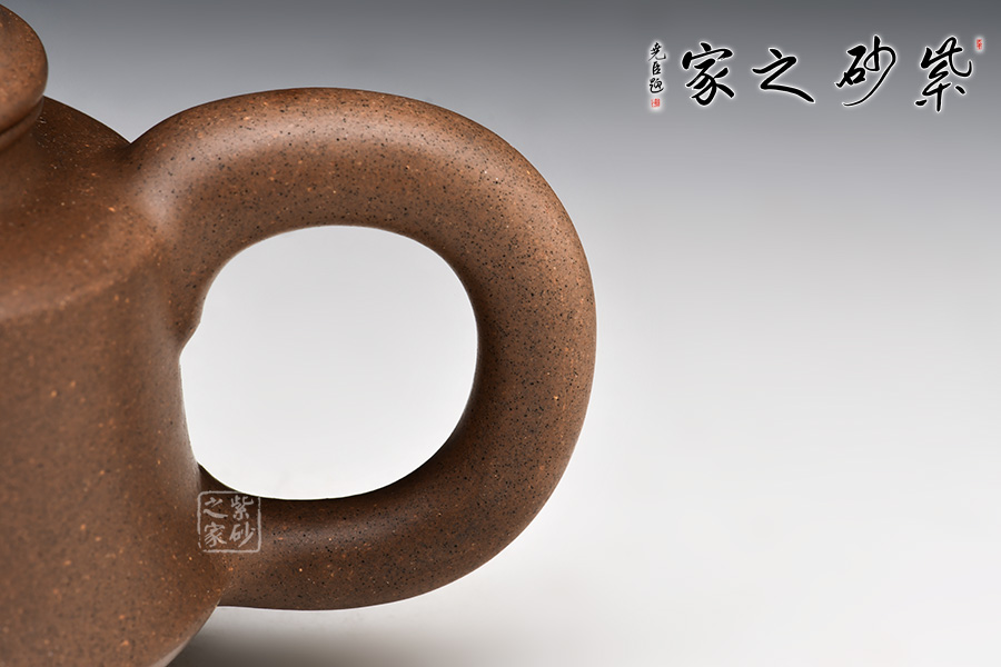 以古代鐘為形,壺身輪廓柔和,比例協(xié)調(diào)。壺底加圈足,和壺頸部上下對(duì)應(yīng),優(yōu)雅氣韻由此頓生。壺蓋飽滿圓潤(rùn)鼓起,蓋上的圓珠壺鈕圓滑可愛(ài),精妙可人。彎嘴胥出自然,出、斷水利落,圈形壺把形態(tài)優(yōu)美,與壺嘴兩相對(duì)應(yīng),更顯此壺特別的味道。