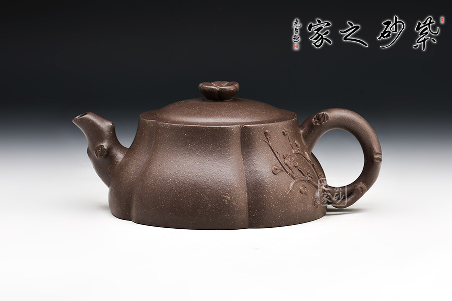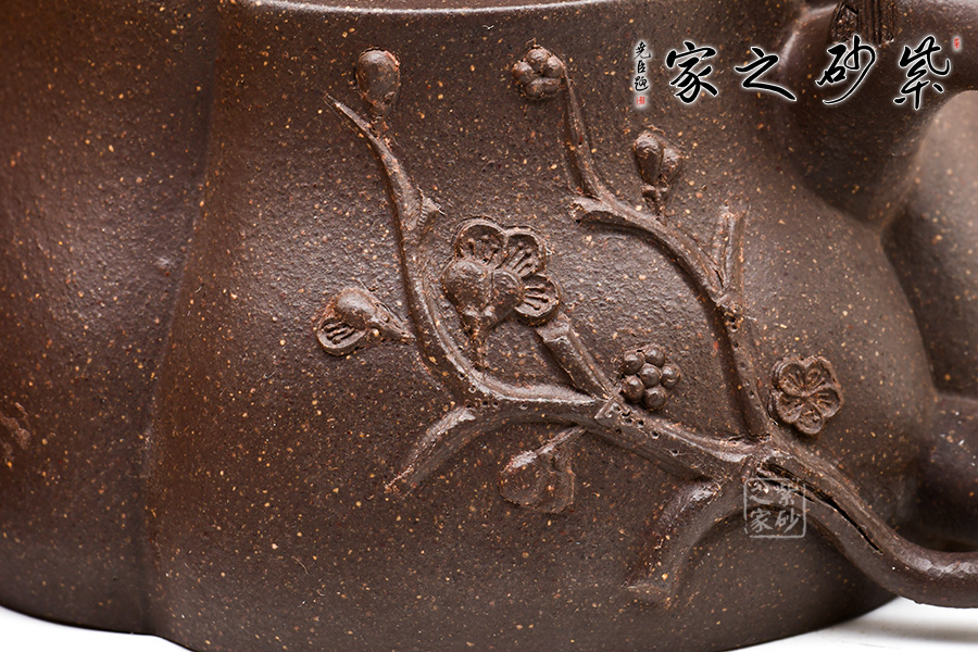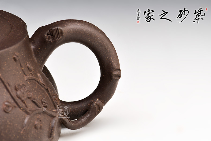 青灰泥為胎,壺身呈六瓣等分,上斂下豐,布局勻稱,弧線圓潤靈活,暗蘊(yùn)骨力。壺鈕如花蕾般含苞待放,嬌艷動(dòng)人。壺流蓄勢昂首,耳把流暢俊逸,均作梅枝形態(tài),線條靈動(dòng)。壺把處新生出梅枝小葉,清新靈動(dòng)。