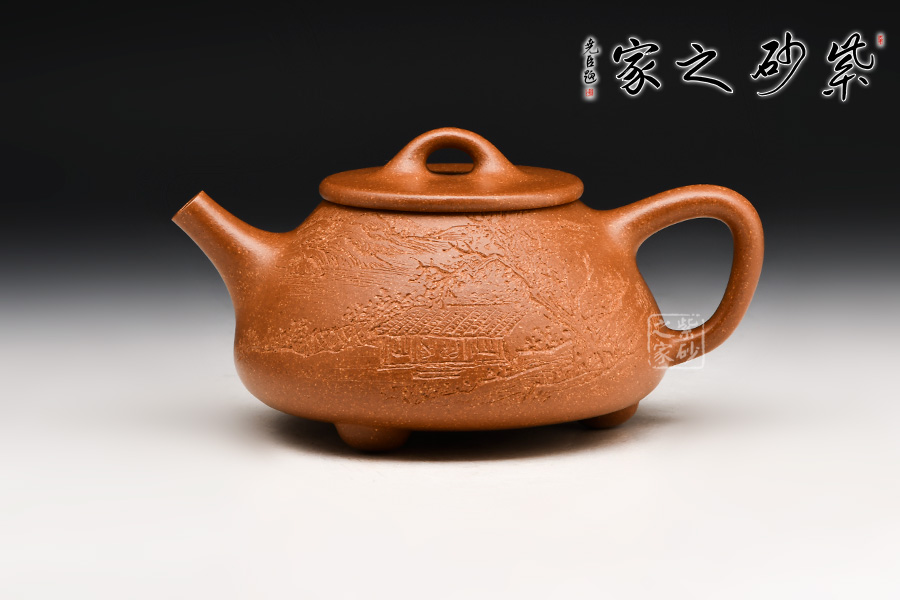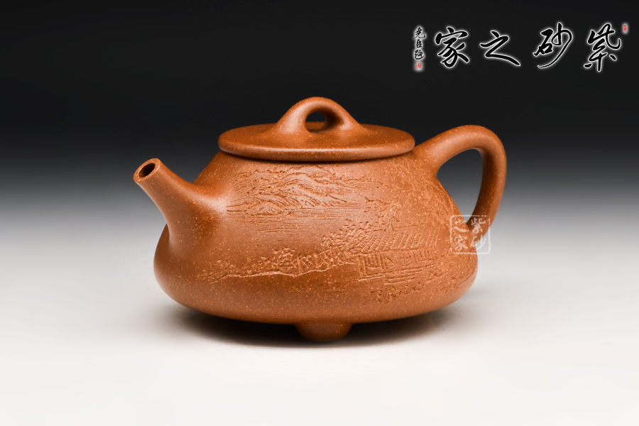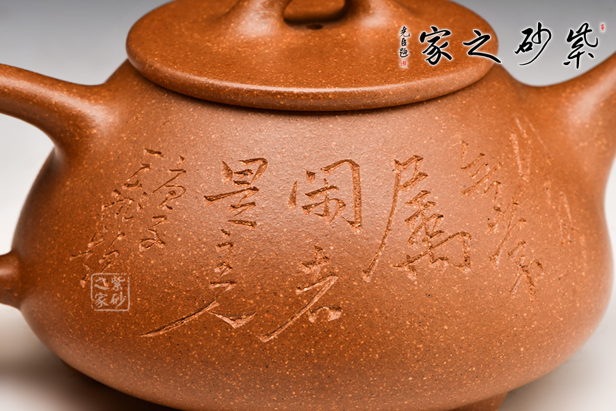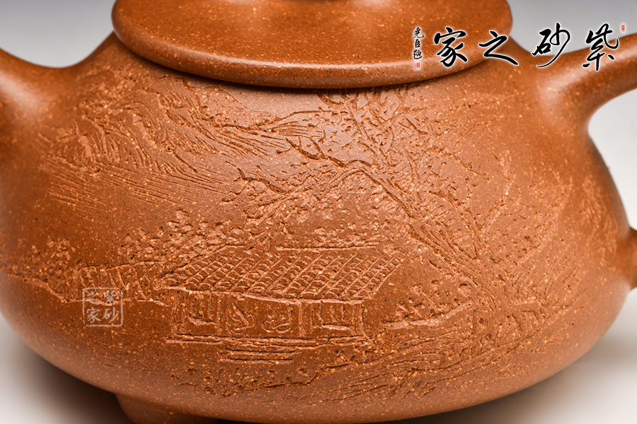 壺身由陶刻名家劉一飛刻繪,山野村舍,自然和諧,更添收藏觀賞價值。