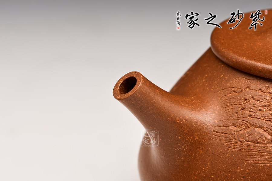 整個壺身呈“金字塔”形,由于重心下垂使用很穩(wěn)當,更具有極大的觀賞性。壺身與壺底的銜接,轉折恰到好處,精神又不失銳氣。流把鈕均為暗接手法,與壺身宛若一體,可見功力。流把張弛有度,比例恰到好處。壺鈕采用常見的拱橋造型,使整款壺在簡單中多了一份活力,壺蓋與壺身嚴絲密縫使此壺具有極高的實用性