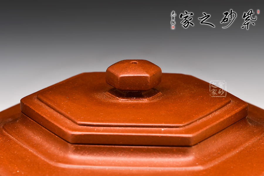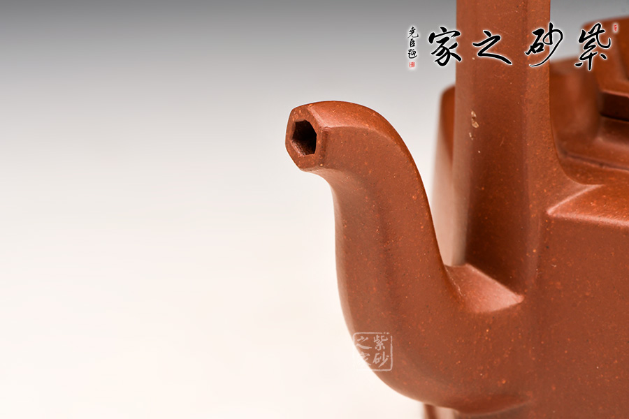 此壺因鈕、蓋、壺身似六方柱形而得名,六方使壺體更端莊大氣。六方鈕于平蓋之上,三彎流自壺身蜿蜒而出,出水爽利,六方的造型與壺身呼應(yīng)。