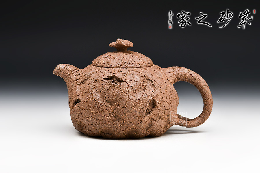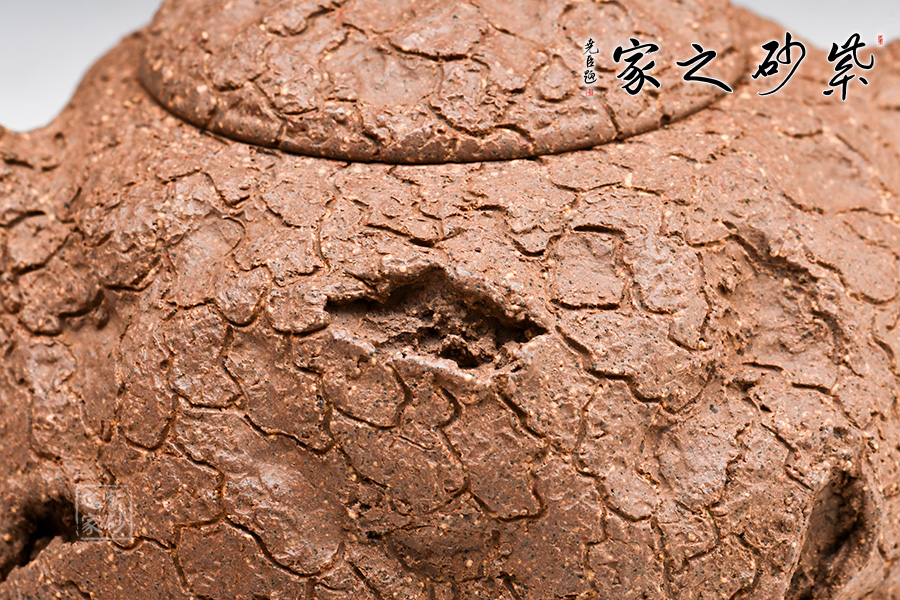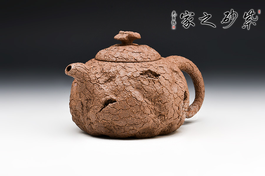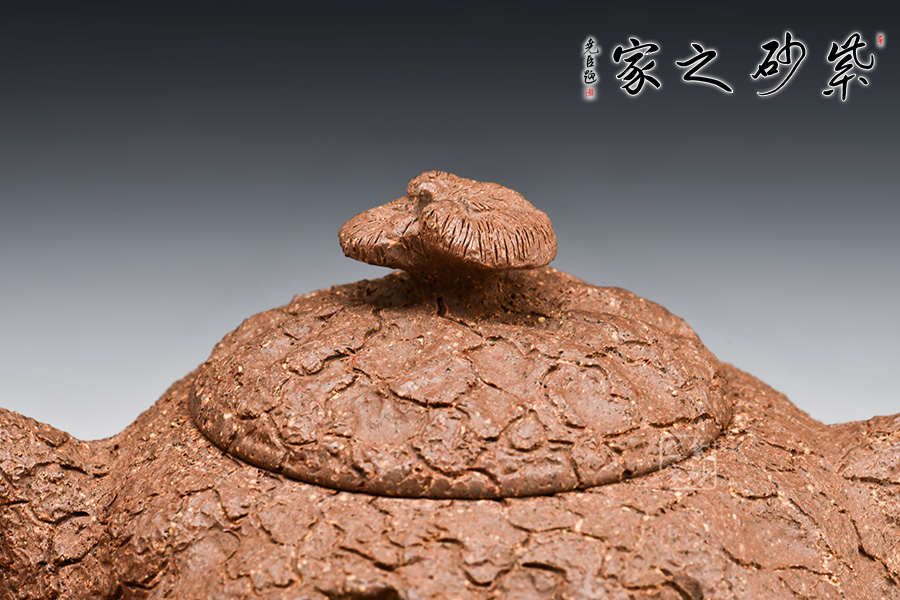 以銀杏樹癭為形,壺蓋上一靈芝為鈕。斑駁的壺體肌理,似百年嶙峋古樹。