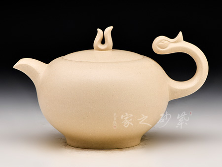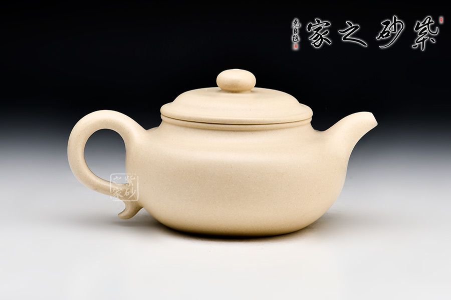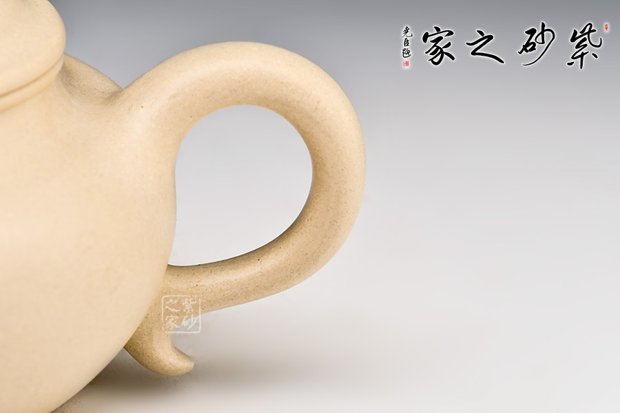 此件仿古,鼓形身筒,拱狀圓蓋,上配圓扁壺鈕,與壺身相呼應(yīng)。短流向上微微胥出,耳形把形態(tài)優(yōu)美,下留垂耳,與壺身連為一體。
