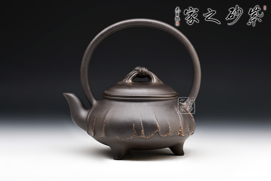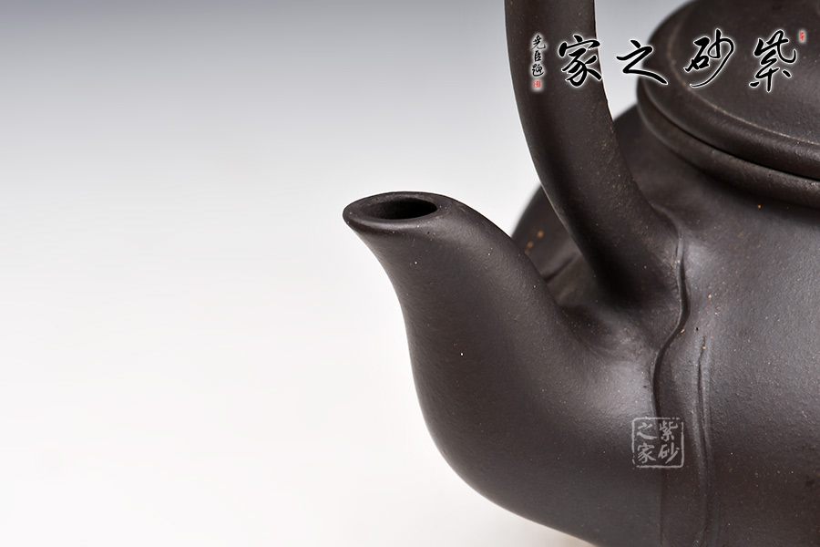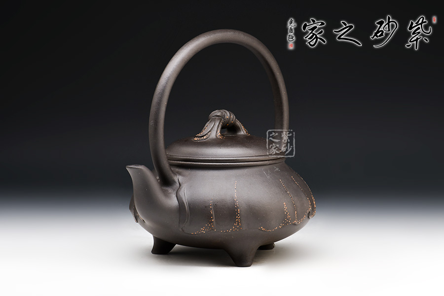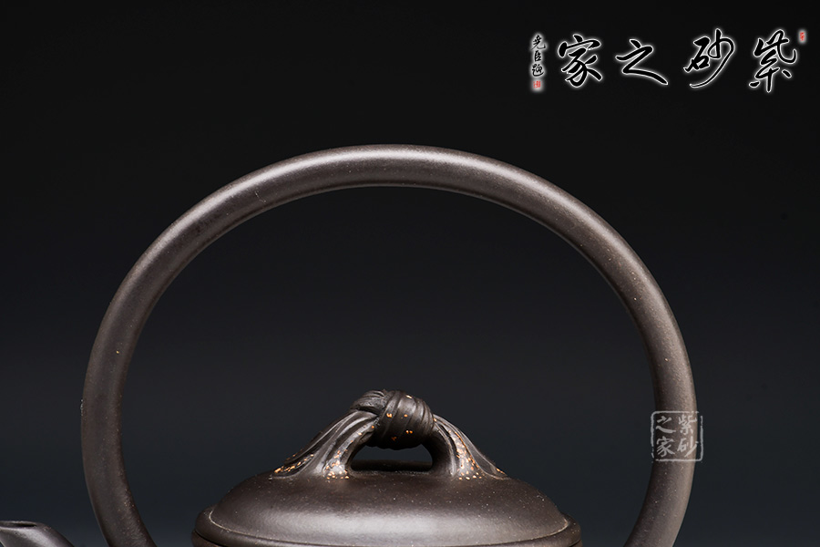 這把壺器型沉穩(wěn)自在,線條流暢自然,工藝精巧,古樸的造型,沉穩(wěn)內(nèi)斂的氣質(zhì),給人一種憨厚自然之感。大肚圓融的壺身,線條飽腹,獨以養(yǎng)韻。配以三彎壺流、提梁把、三足底以及“打結”形的壺鈕,更添一份憨然可掬。