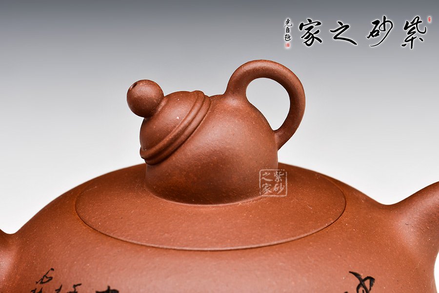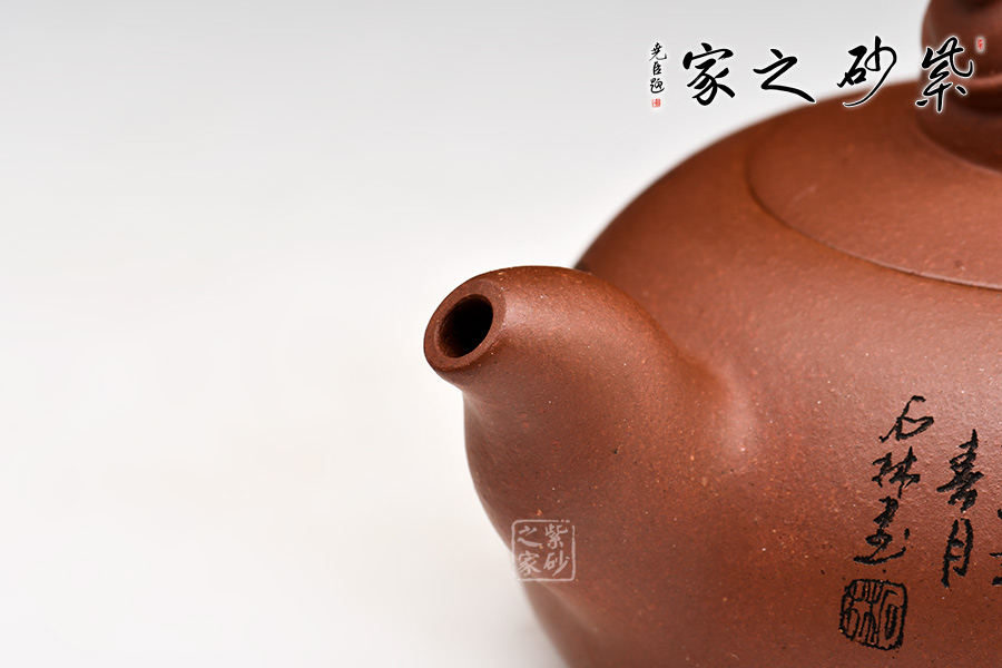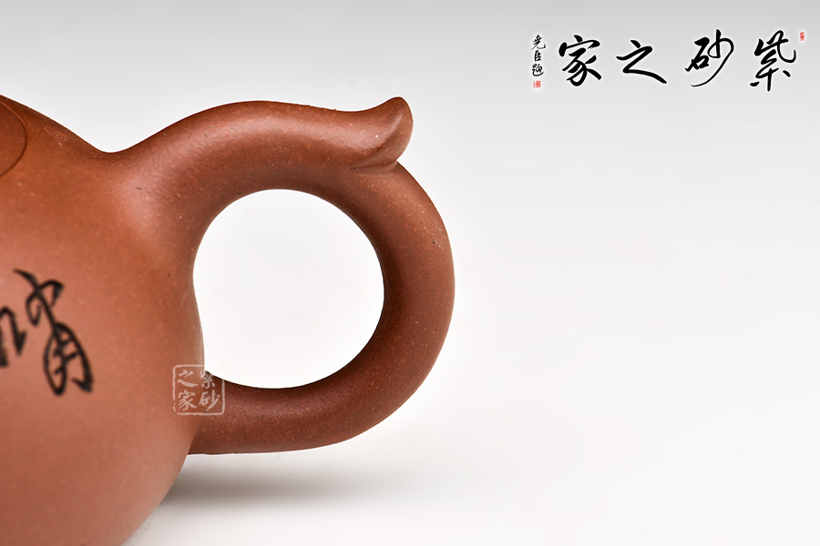 橢圓壺身,線條流暢;嵌蓋略微渾厚,子母線口蓋溫和嚴(yán)密;彎流嘴胥出,肥瘦得宜;壺柄略微上抬之后優(yōu)雅滑落而下,形成一條圓潤(rùn)飽滿的弧線,樸雅大方。整壺骨肉亭勻,簡(jiǎn)練大方,制作頗見功力。