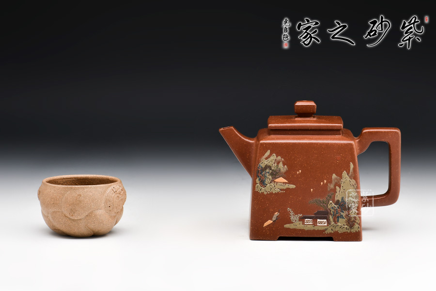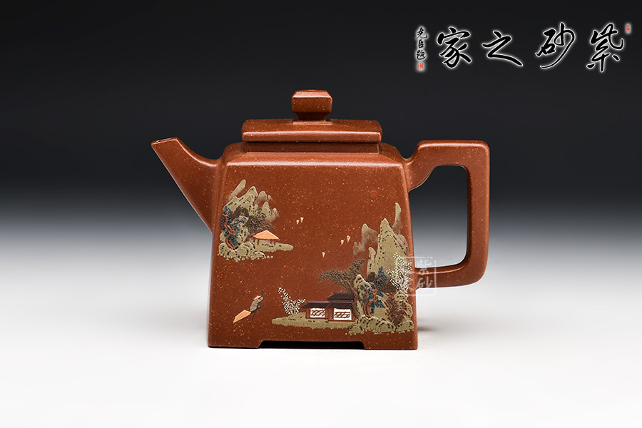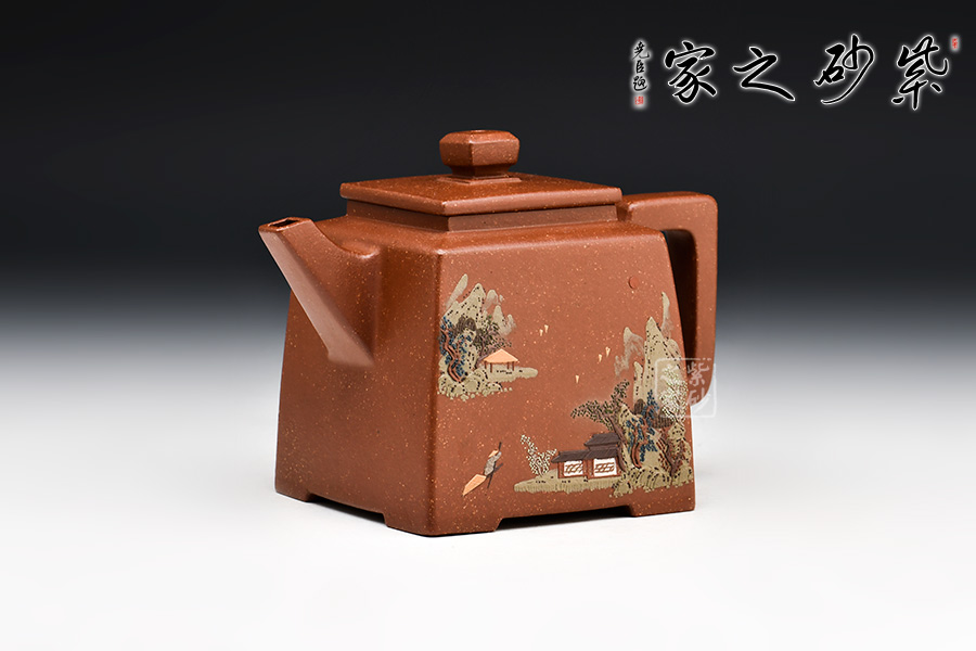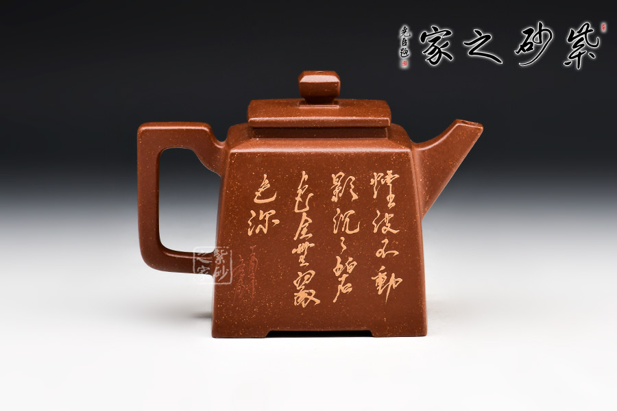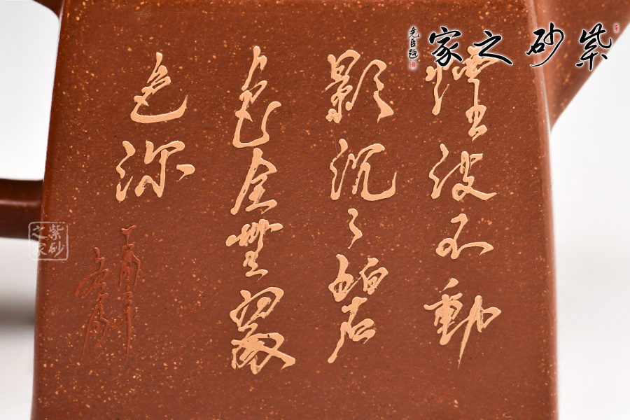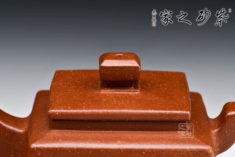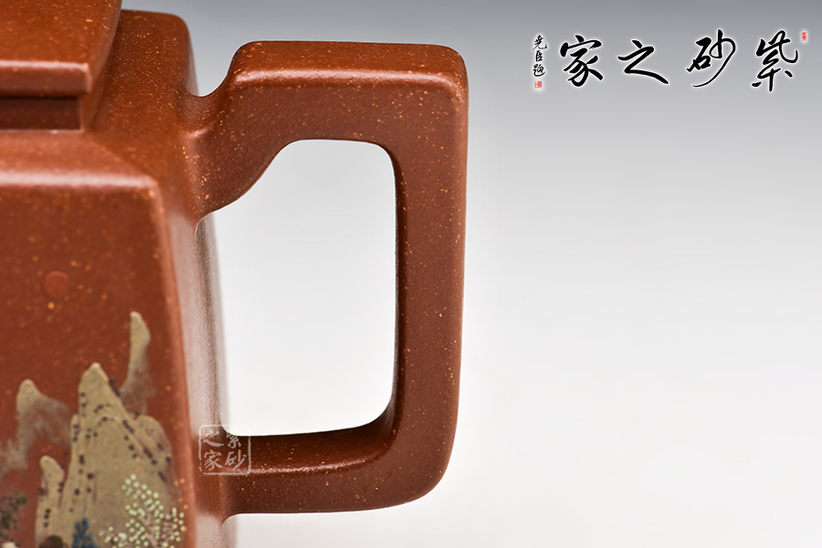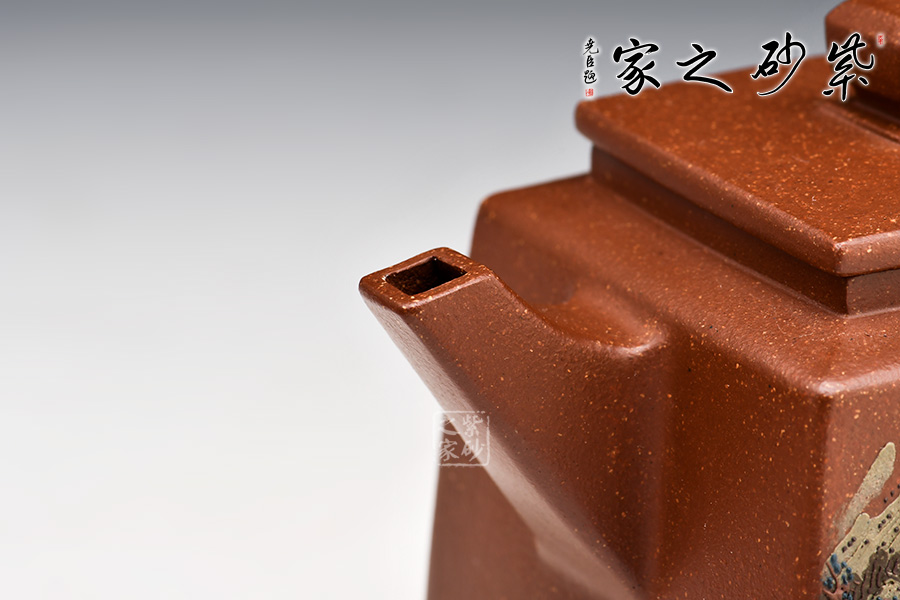 四方高升壺形體優(yōu)美,工藝嚴謹,氣韻生動,造型古樸,技法獨特。整體采用稀有泥料降坡泥制成,透氣性強,表面有清晰的五彩斑斕的天然顆粒,煞是好看。壺身、壺嘴、壺蓋、壺鈕、壺把皆為方形,塊面挺括,線條利落,比例準確,透露出豪爽、剛勁、正直的陽剛之氣。