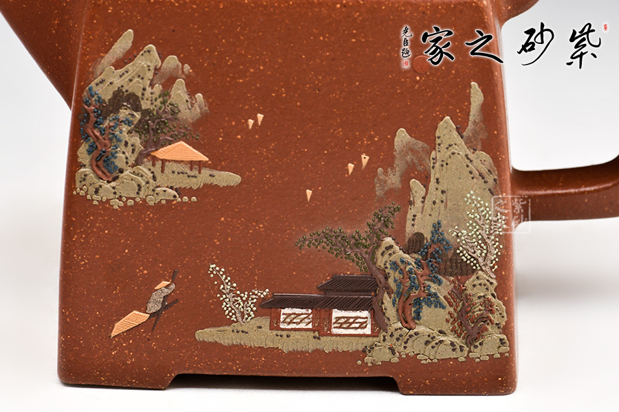 壺身一面使用泥繪手法,勾勒出一幅青山之下有人家的美圖,手法精湛,意境唯美,勾人心魂。整壺力度到位,其工藝水平毫不遜色于其它造型。