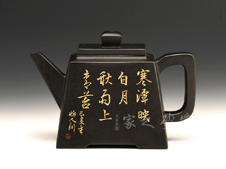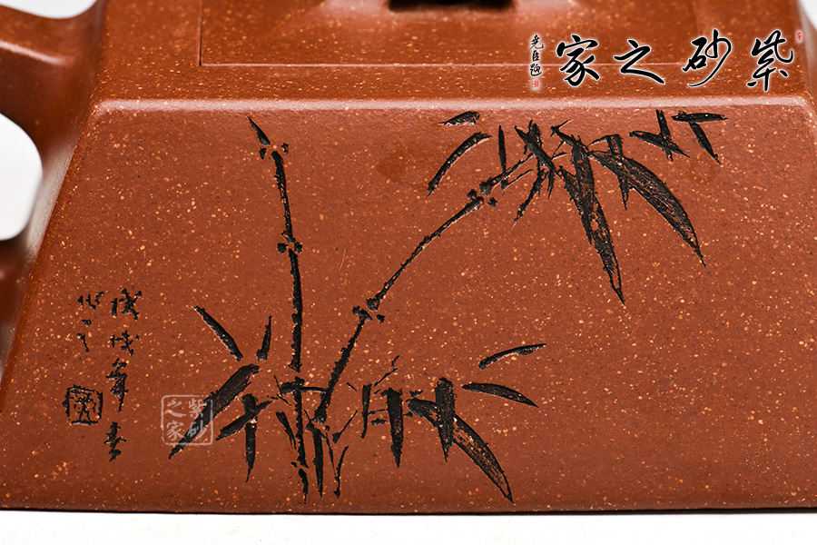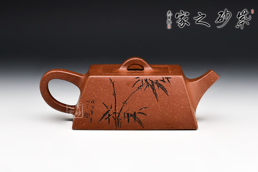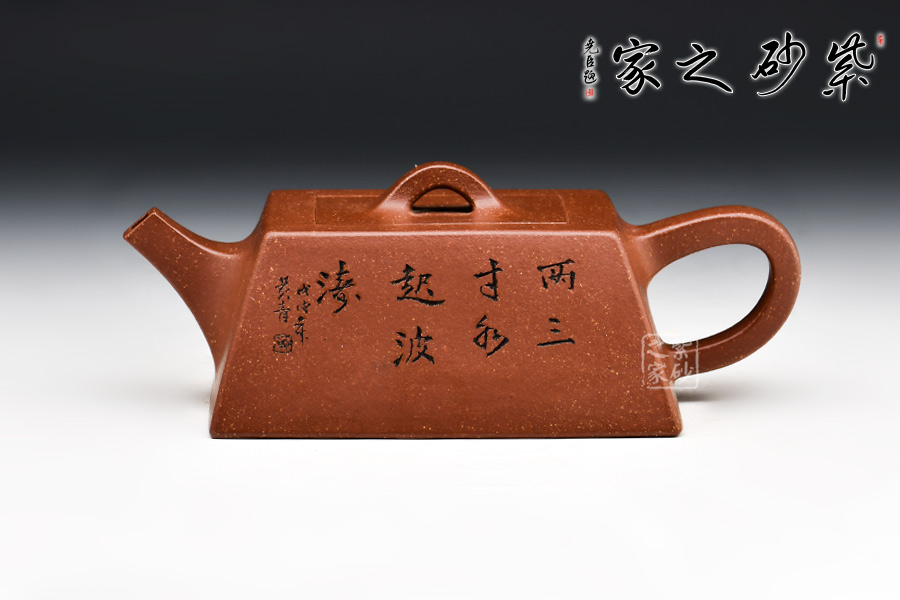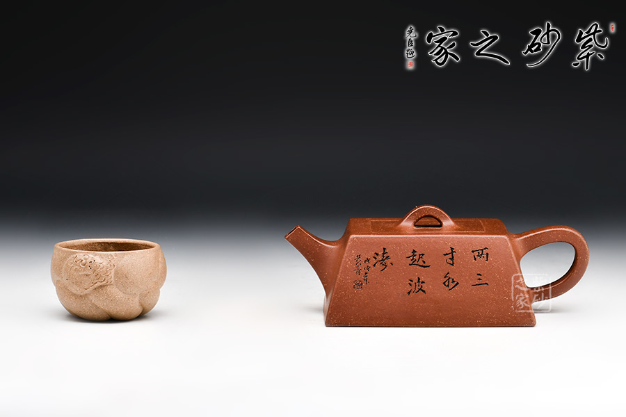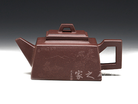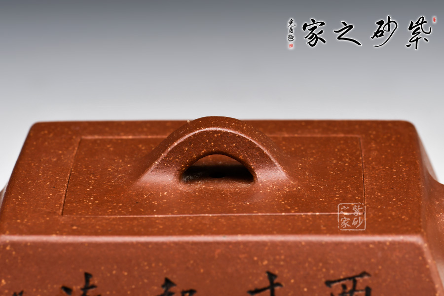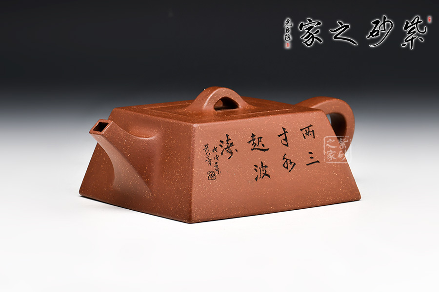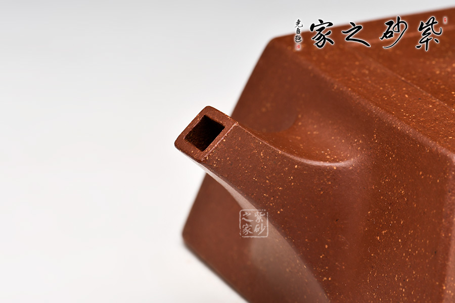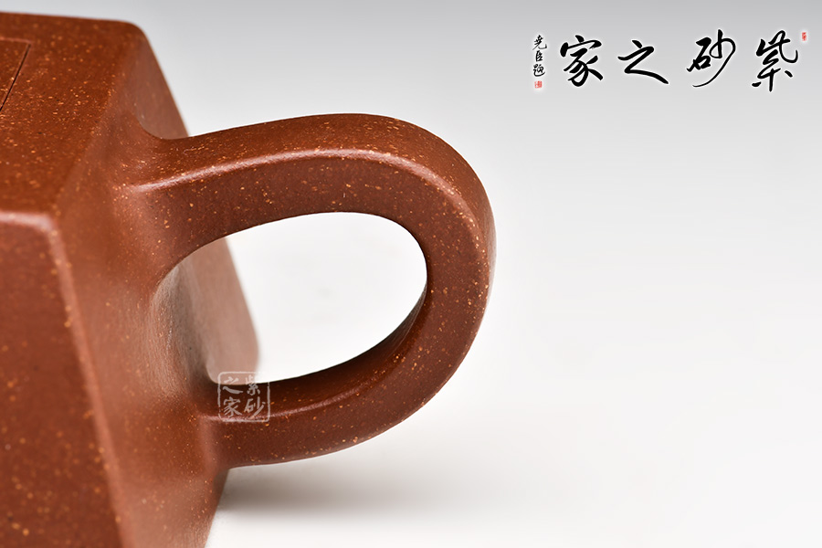 此款升方作品以梯形為基準,穩(wěn)重剛強又不呆板單調(diào)。壺身大氣敦厚,棱線分明;壺嘴短接直流,收放自如;壺把圓潤上翹,壺鈕拱若虹橋。整體溫潤大氣,剛柔并濟。