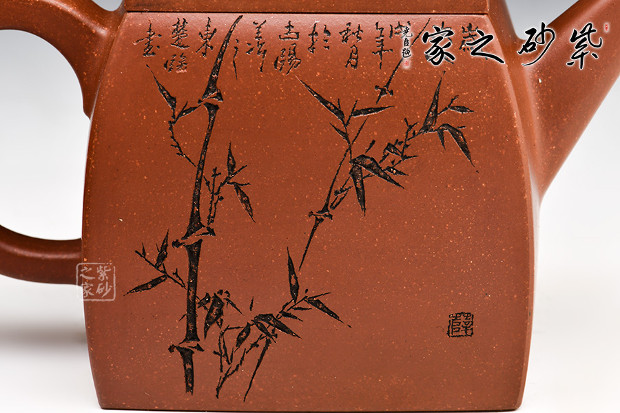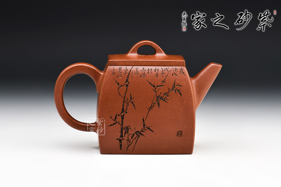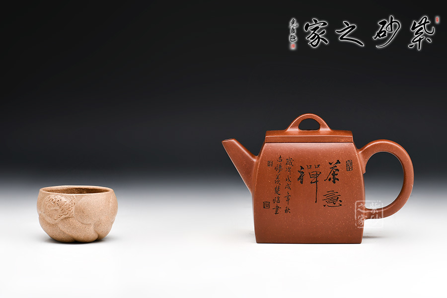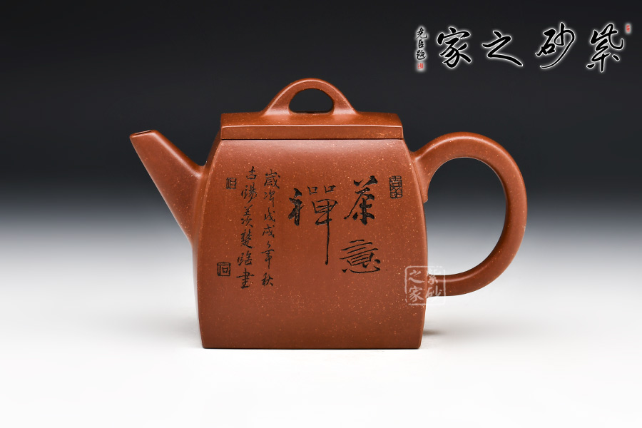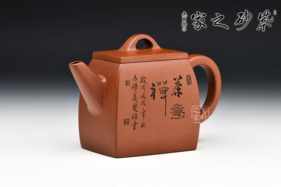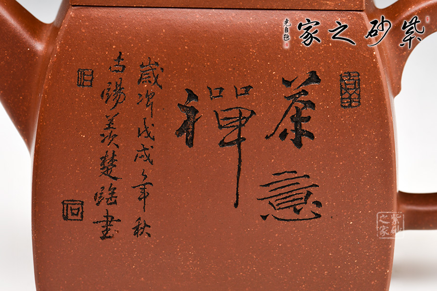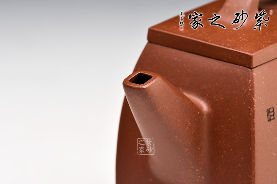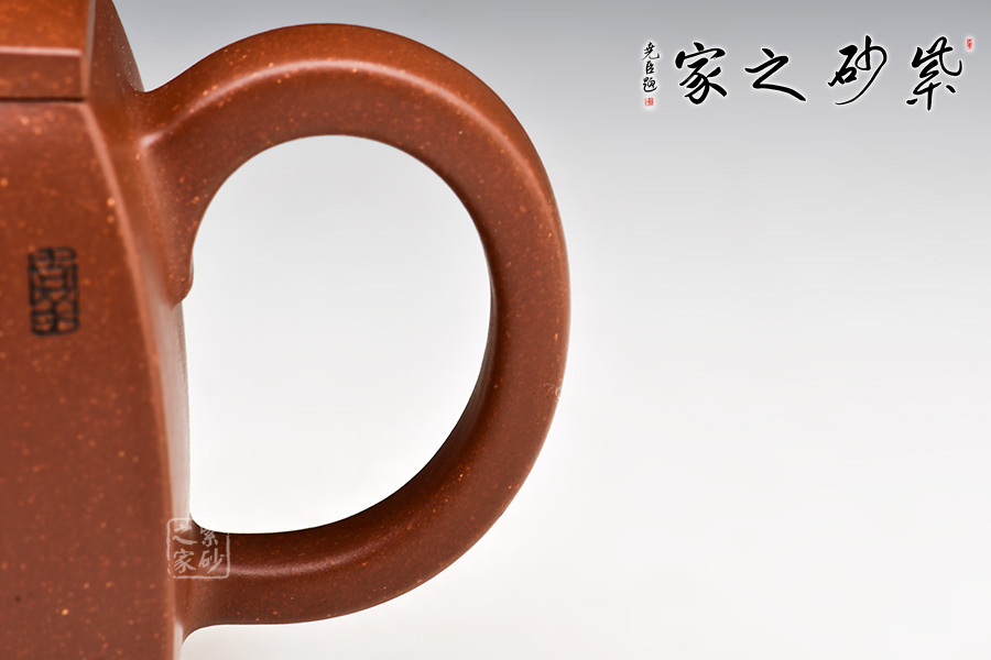禪方壺身以梯形為基準(zhǔn),略鼓,穩(wěn)重剛強(qiáng)又不呆板單調(diào)。壺蓋方形,上有橋型鈕,與壺身完美契合,保溫性能好。壺嘴朝天,出水爽利;耳型把,樸實(shí)大方。