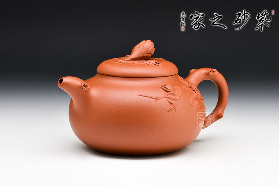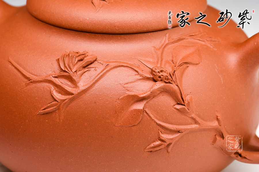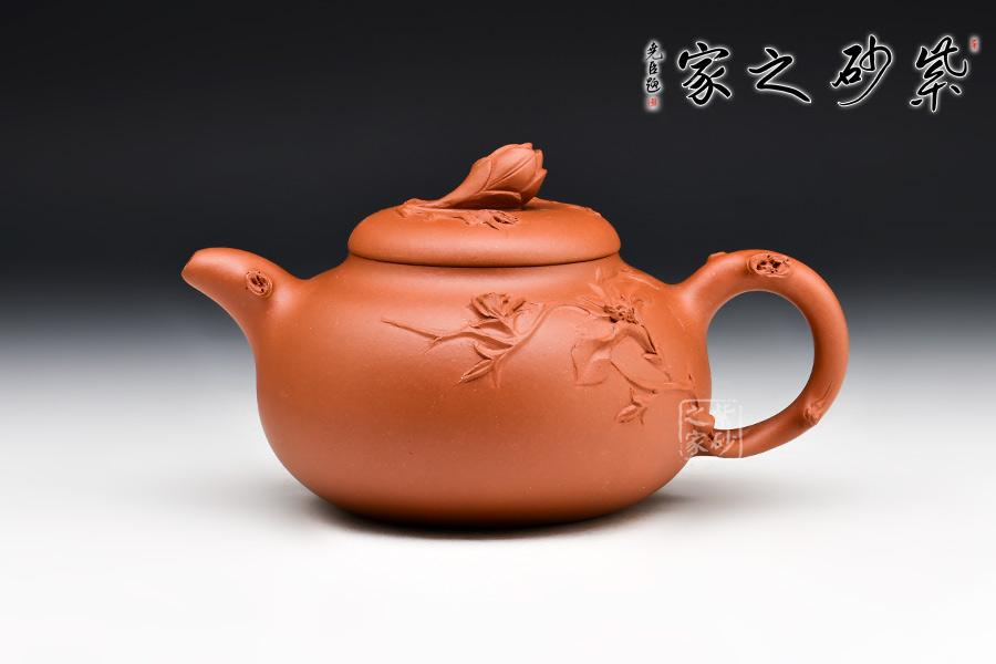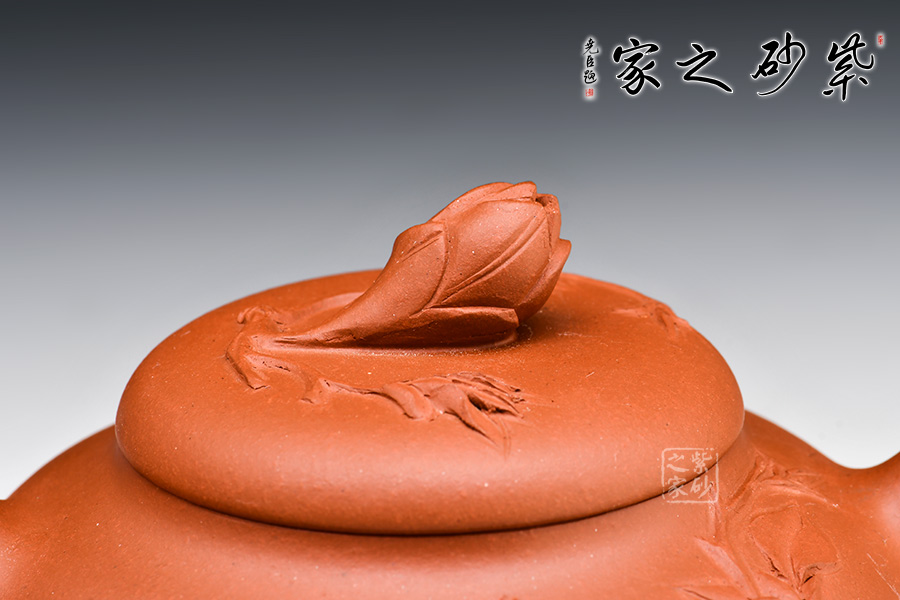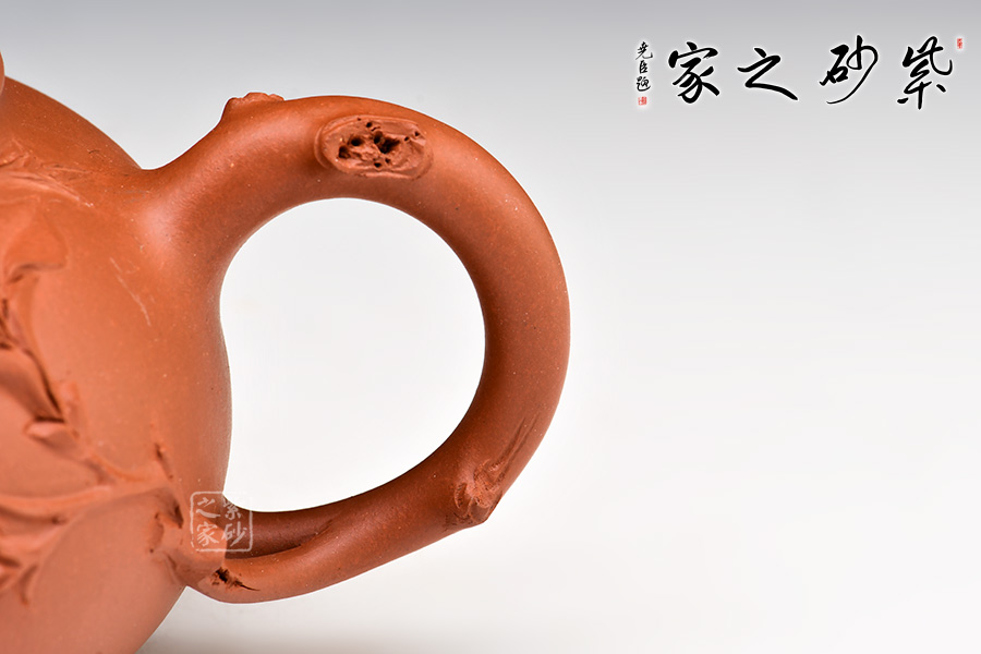 壺嘴與壺把都是花枝造型,彎嘴出水流暢,嘴頭鼓起,形成了細(xì)膩柔美的嘴口。壺把自壺身底部胥出,相接處生出細(xì)嫩的花枝,開(kāi)出美麗的玉蘭花朵。壺鈕如同一朵含苞待放的玉蘭,匍匐在壺蓋上,花苞朝天,提捏方便。