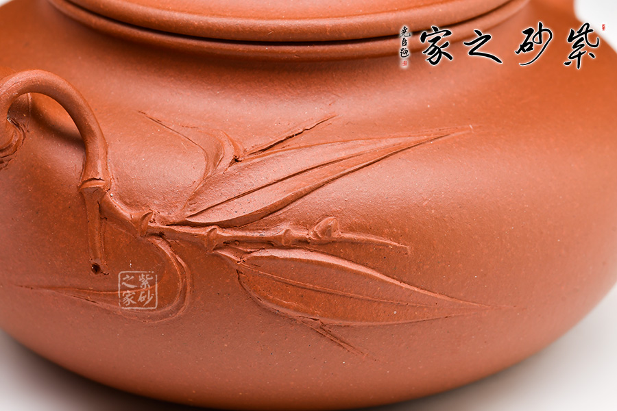 竹桃壺采用原礦清水泥全手工精制而成,造型別致,做工精細(xì)。壺身扁圓,壺嘴和壺把呈竹節(jié)造型,細(xì)節(jié)處理得當(dāng);壺嘴處延伸出一段竹枝,宛若壺身長出脆嫩的竹葉,生動形象,栩栩如生;壓蓋,上有蔥郁桃葉,精巧小壽桃為鈕,美輪美奐。