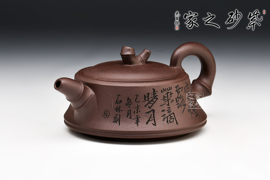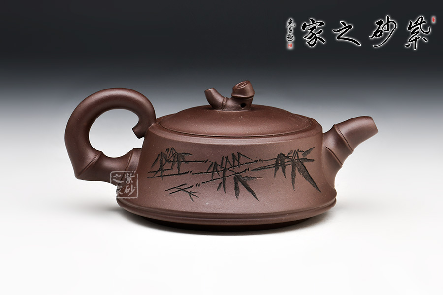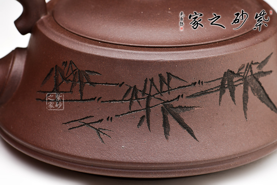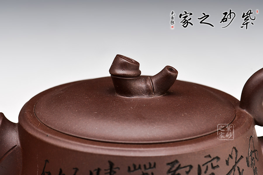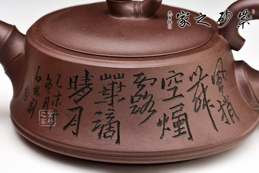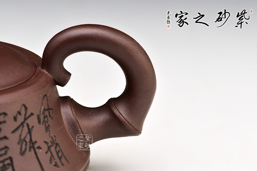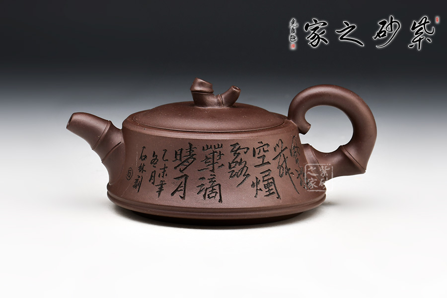 壺身為不規(guī)則竹節(jié)狀,壺腹內(nèi)凹,刻詩句“風(fēng)梢舞空煙,露葉滴晴月”,清新閑趣之情頓然生出。壺嘴似小竹節(jié)節(jié)節(jié)伸出,出水渾圓雄厚。壺柄,下端為整節(jié)連著壺身,到上端貼合在壺身上,自然又美觀。嵌蓋,竹節(jié)為鈕,古樸雅致。