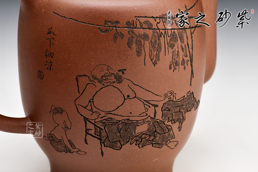 B面: 裝飾: 瓜下納涼 裝飾者:石林 裝飾內(nèi)容: 瓜藤下一老翁,一稚童,悠閑自在,好不愜意!