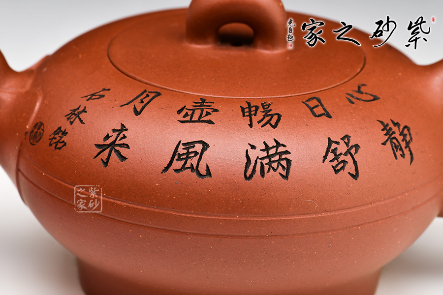 A面: 裝飾: 銘文 裝飾者:石林 裝飾內(nèi)容: “心靜日舒暢,滿(mǎn)壺風(fēng)月來(lái)”