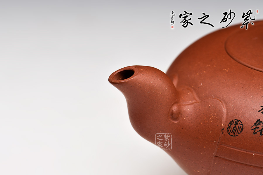 該壺壺體扁圓,氣韻貫通;壺托如柱,沉穩(wěn)可靠。一彎壺嘴,出水利落;壺把從壺身胥出,向下彎曲,形成優(yōu)美圓弧線(xiàn);壺鈕拱如橋,小巧精致。