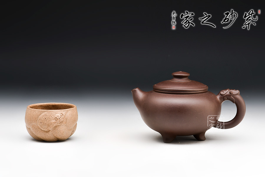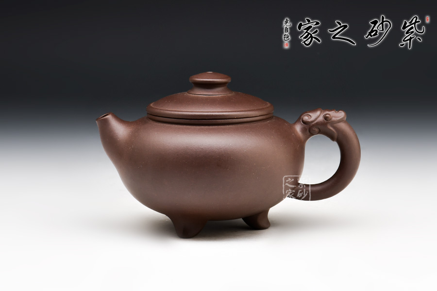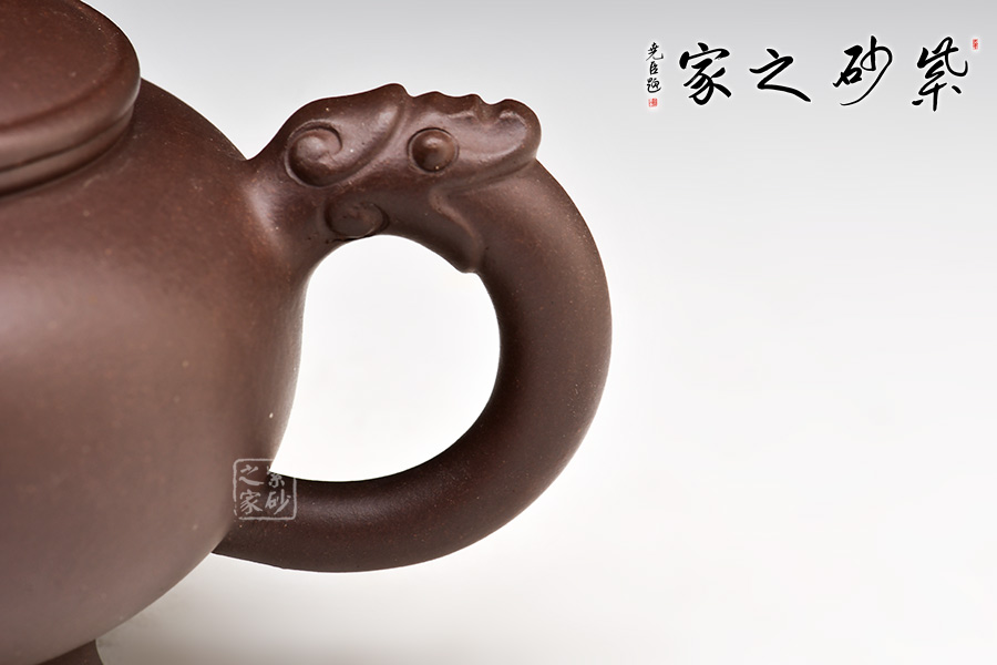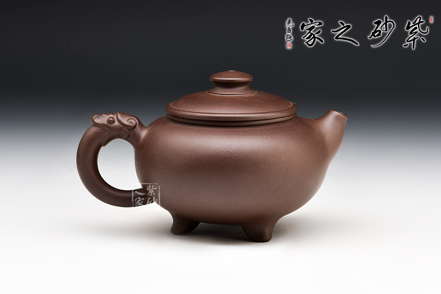 三角龍壺可分為四部分。壺底三足,呈鼎力之勢,牢固可靠;壺身滾圓,壺嘴短小急流,壺把宛若龍吐長舌;圓形壺蓋,與壺身沿線重合,層次分明;圓形鈕,立體別致。