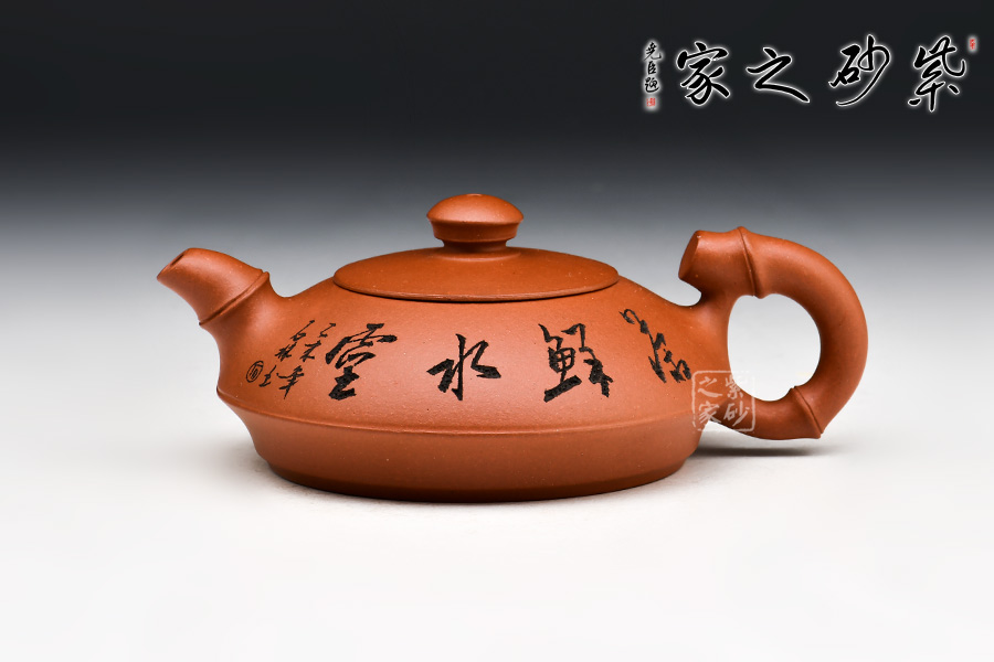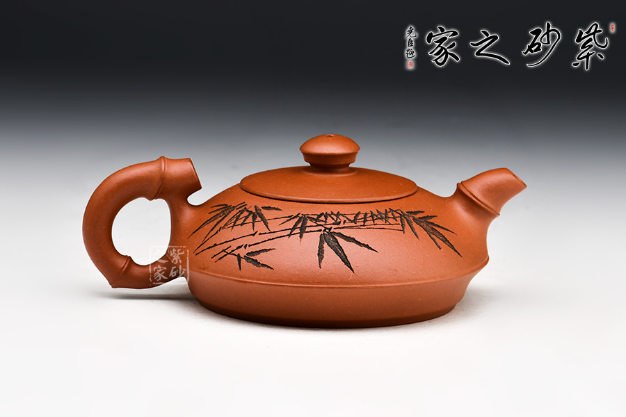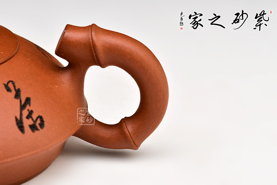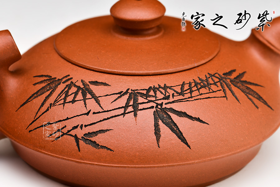 逸竹壺壺身扁圓,與壺托相交處形成沿線。壺嘴和壺把皆由沿線而出,為竹節(jié)狀,形象生動(dòng)。圓形蓋,“傘”形鈕,上點(diǎn)一小孔。身前銘刻“茶鮮水靈”四字,身后有畫(huà)“竹節(jié)蒼翠,竹葉青青”,一股閑適舒暢之情油然而生。