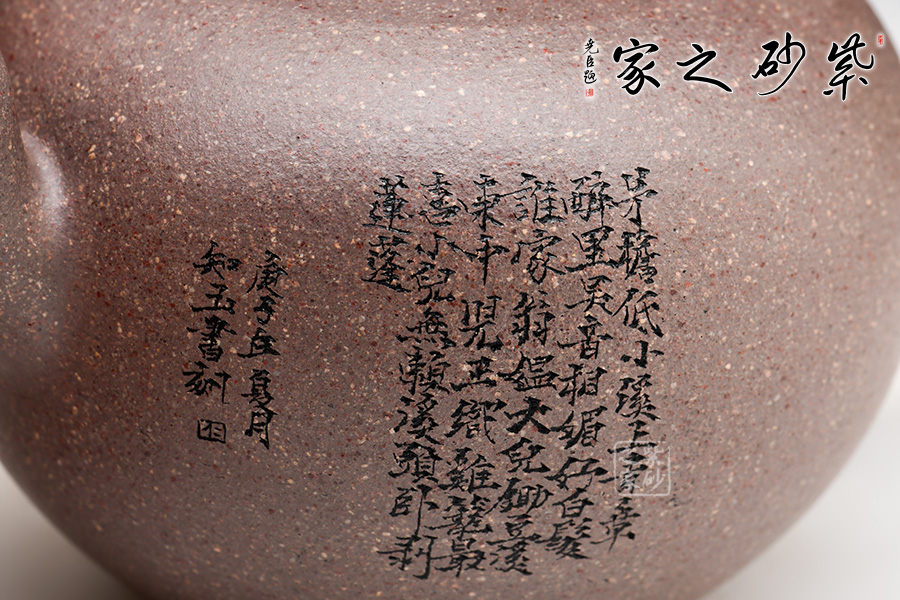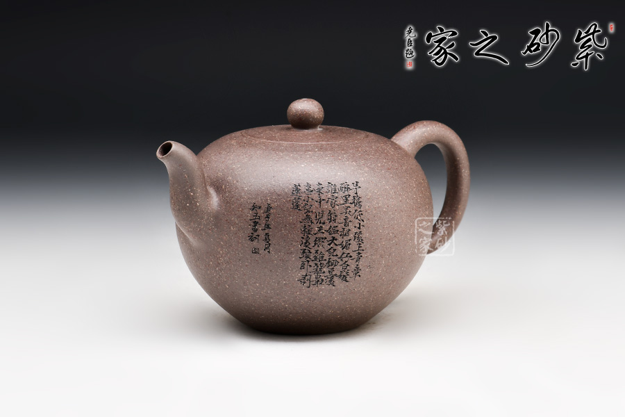 張旭辰老師所制一粒珠,采用青灰段泥制成,色澤深紫灰,質(zhì)地綿密,砂感重而不刮手。壺體圓球形,無頸,嵌入式壺蓋,小圓珠鈕,三彎式管狀流,耳型環(huán)把。整體造型簡(jiǎn)樸古雅,比例協(xié)調(diào)和諧,線面勻稱流暢,達(dá)到了很高的藝術(shù)境界。