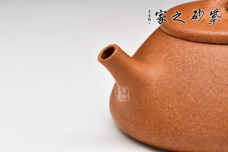 壺身呈“八”字,曲線柔和流暢;直流嘴如鋼炮挺出,出水順暢;橋形鈕壓蓋,渾厚有力;壺蓋與壺身嚴密切合;倒三角把線條飽滿,力道十足,提捏有力。