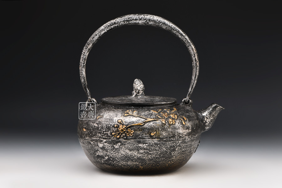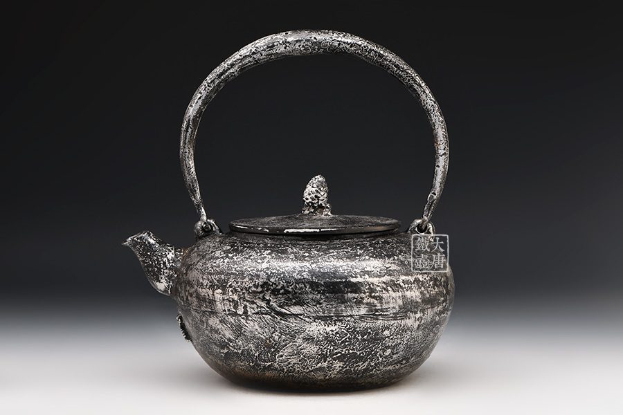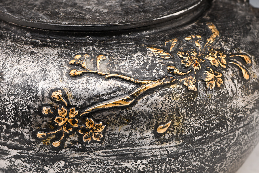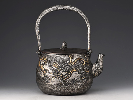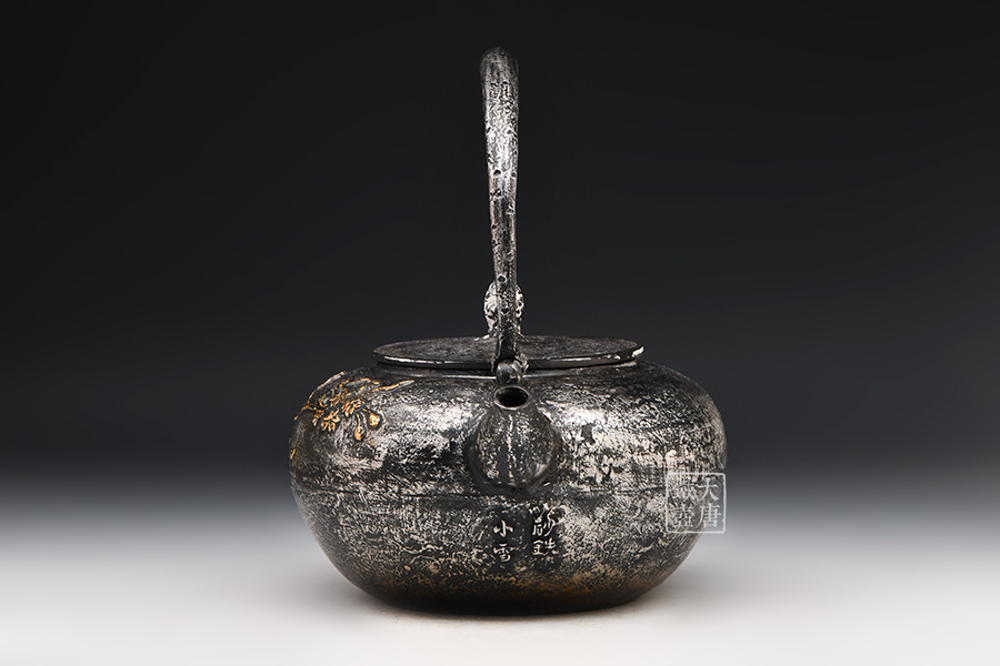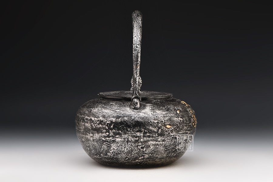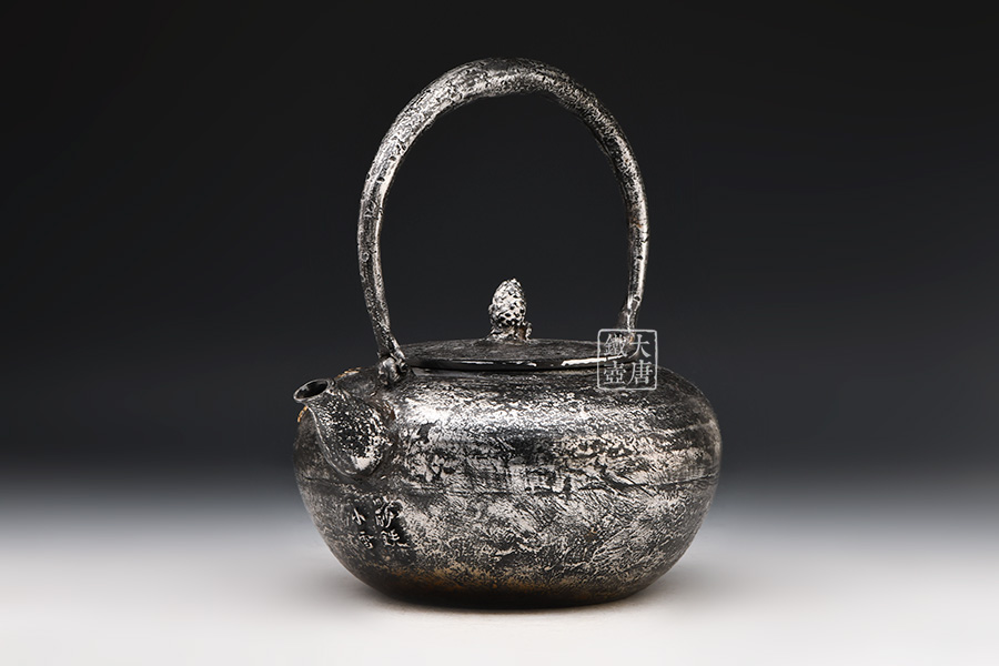 荒井工房的鐵瓶除了在鑄造工藝上有嚴格的規(guī)范和體系,在鐵瓶裝飾技術(shù)上也頗有建樹。除了傳統(tǒng)的印刻技術(shù)外,荒井工房還掌握了非常出色的金銀鑲嵌技藝,尤其以大片的鏨刻銀片最為出眾,這在山形當?shù)靥每谥歇殬湟粠谩?/p>