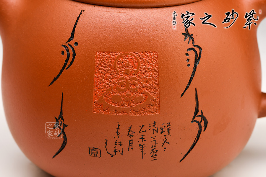 多年的學(xué)習(xí)積累,裝飾風(fēng)格自成體系,創(chuàng)作了系列化裝飾作品,成為全方面將中國文字學(xué)和傳統(tǒng)文化融于紫砂藝術(shù)的第一人。相較于紫砂藝術(shù)中常用文字,夏素紅老師所用文字裝飾效果更有唯一性和獨(dú)特性。中國稀有、失傳文字學(xué)的使用彰顯其作品有強(qiáng)烈的個(gè)人風(fēng)格,亦是復(fù)古風(fēng)的代表性佳器。