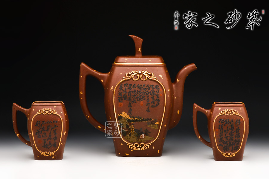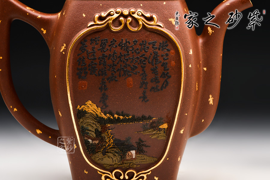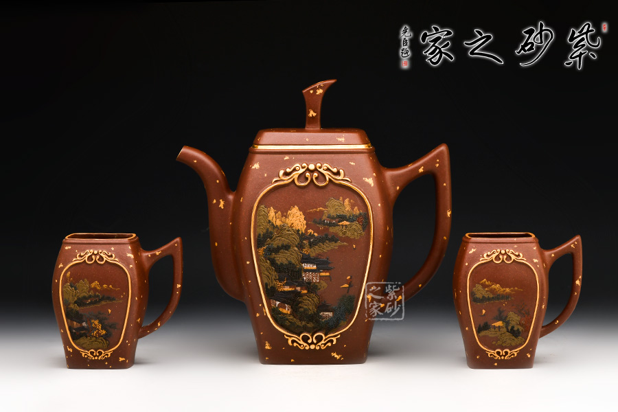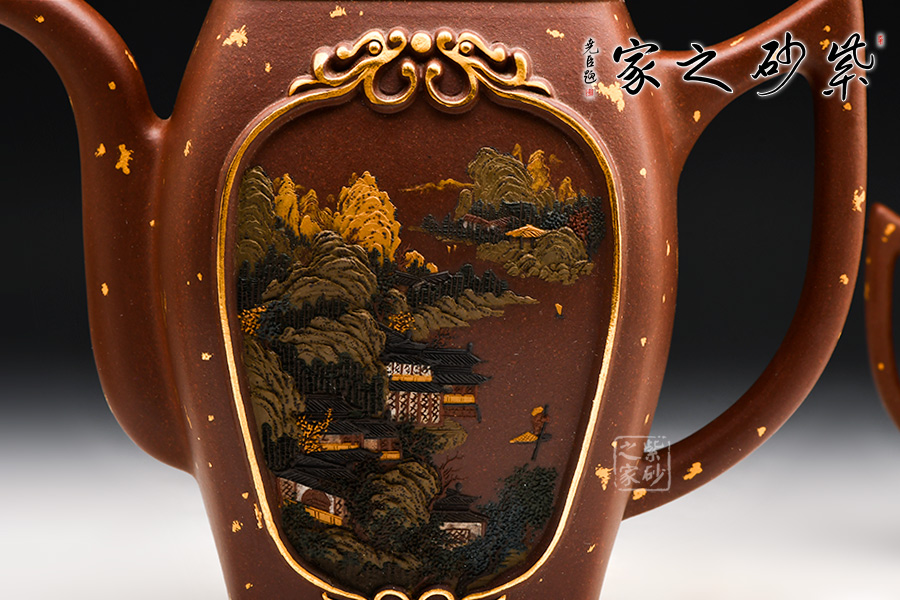 此款龍御天下壺以雙龍包容江河大川為主體,將雕塑和泥繪相結(jié)合,布局嚴謹,畫面氣象開闔,自出機杼,并配雙套杯,適合二三友人相聚品茗。