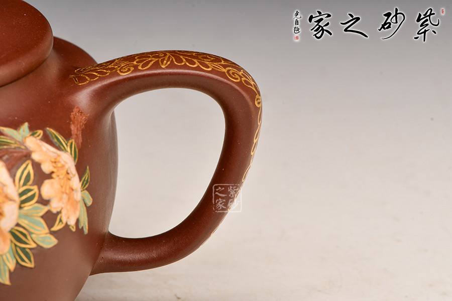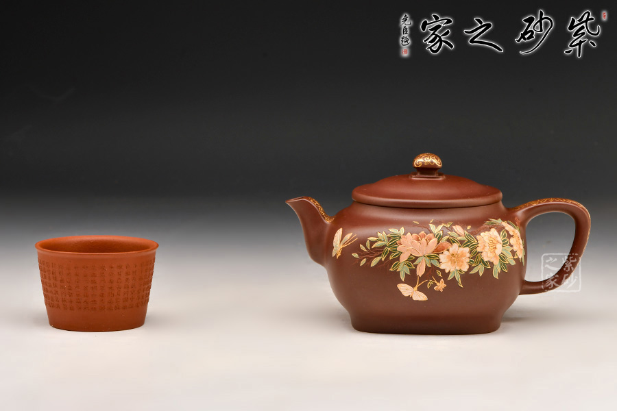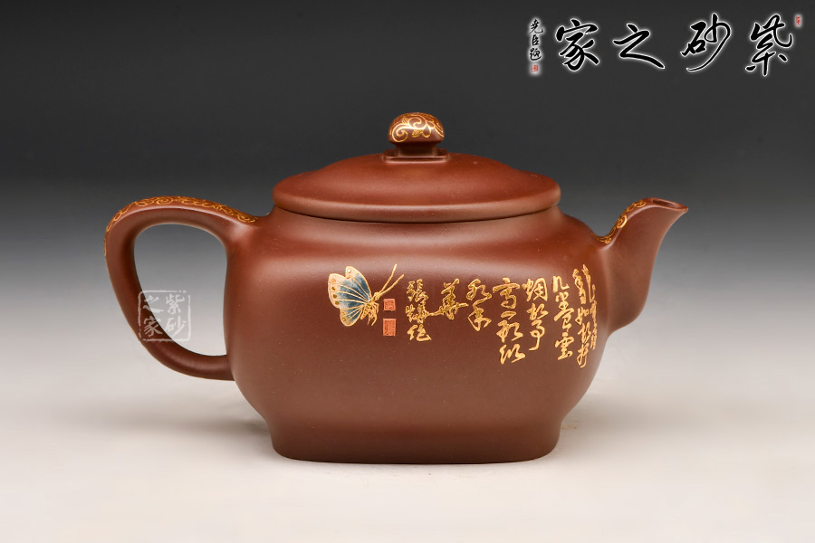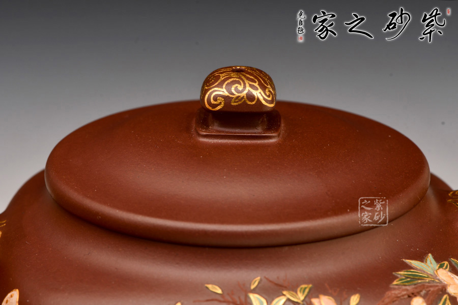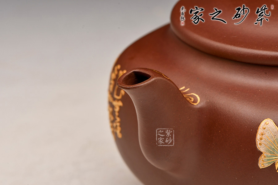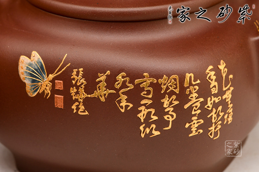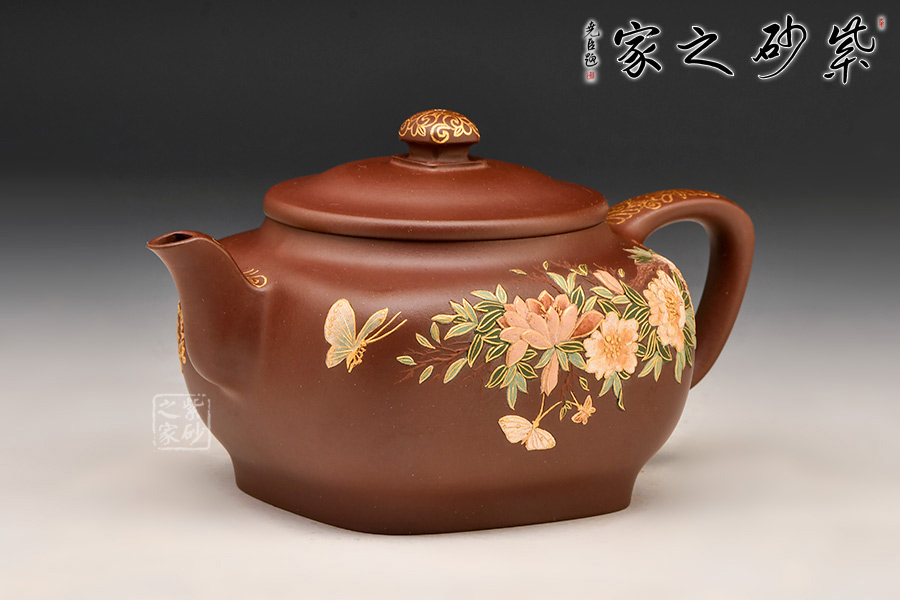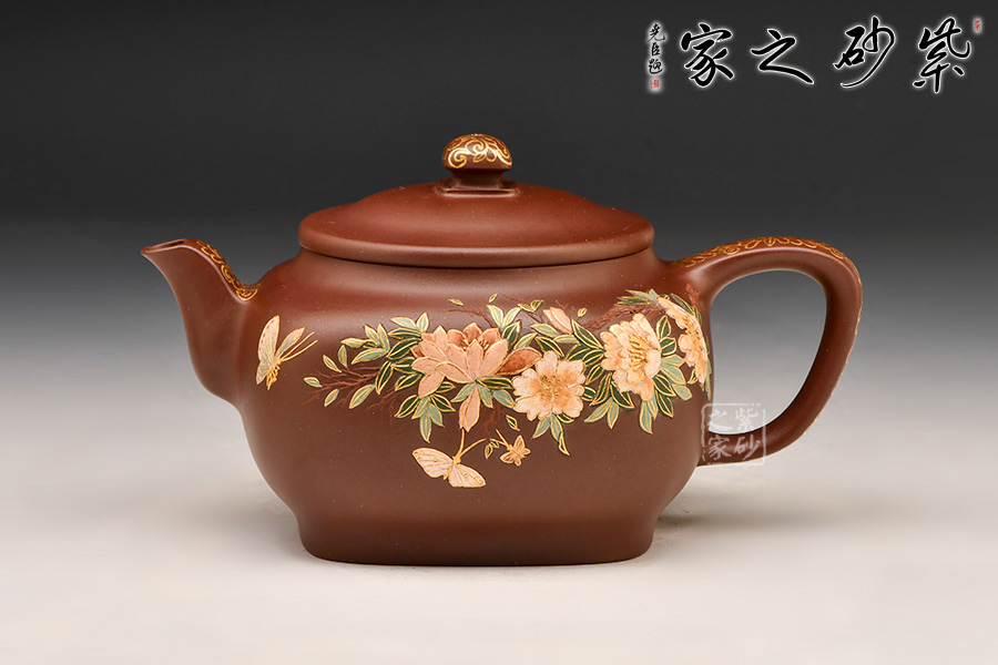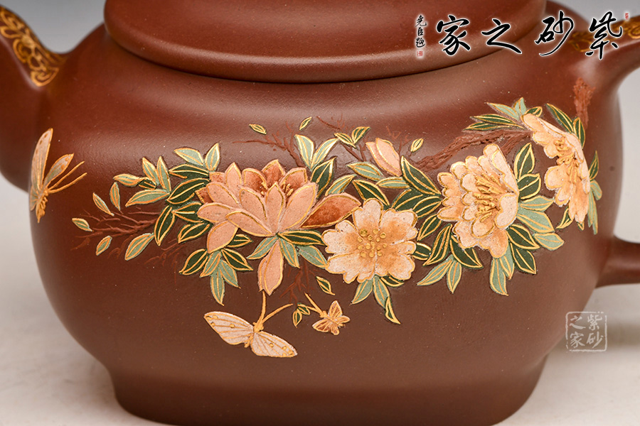 造型典雅端莊、貴氣十足,色澤細膩柔和,壺身方圓結(jié)合,圓潤飽滿。壺身運用泥繪加描金等裝飾工藝,繪繁花蝶影,美妙絕倫,依靠泥的厚薄與不同色泥的表現(xiàn)效果,展現(xiàn)出中國傳統(tǒng)筆墨的韻味和意境,如同薄意浮雕,有鮮明的層次感,高雅精致,值得珍藏。