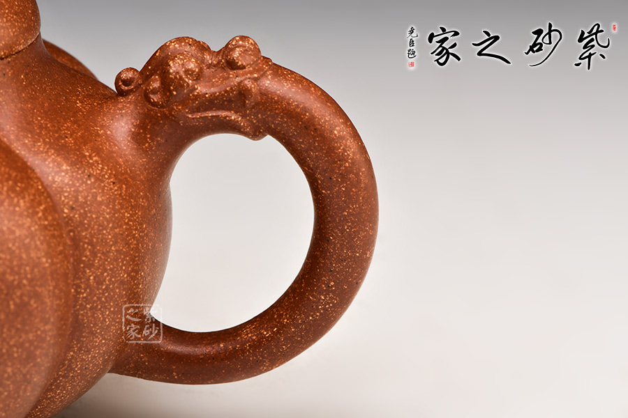 壺嘴、壺把設(shè)計極為巧妙:壺把龍頭出水而下成耳形,壺嘴向上出水為小口。整體銜接天衣無縫,令人拍案叫絕!