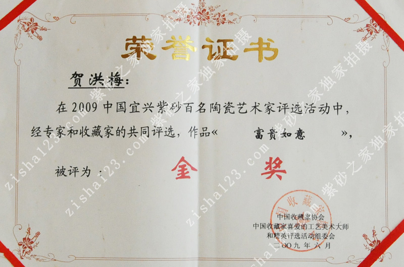 2009年——《富貴如意》榮獲中國宜興紫砂百名陶瓷藝術(shù)家評選活動金獎;