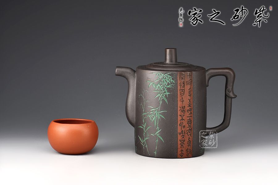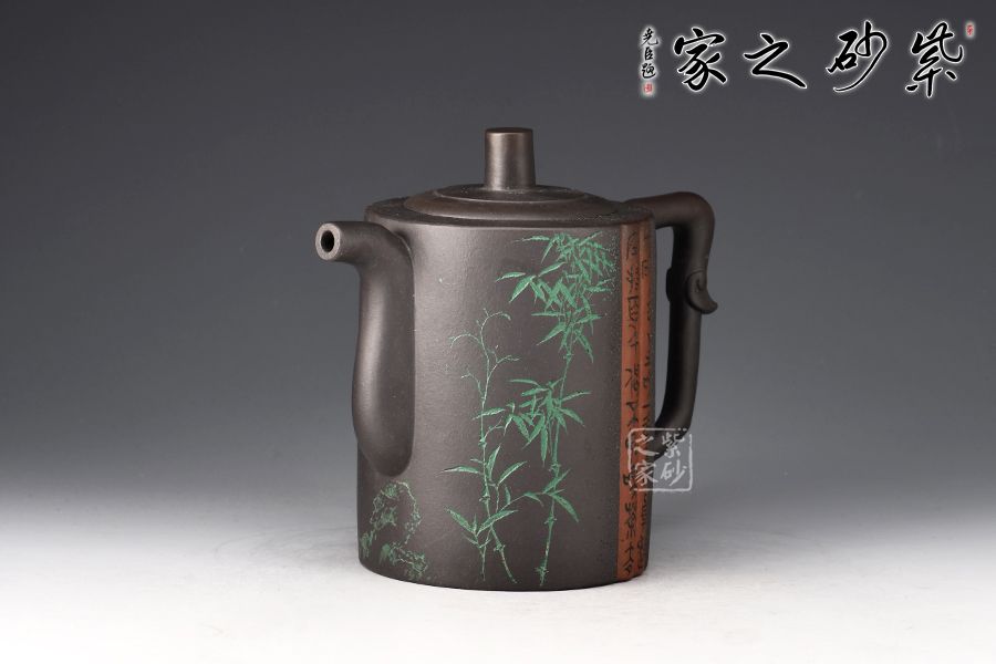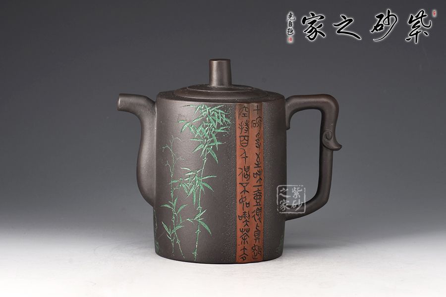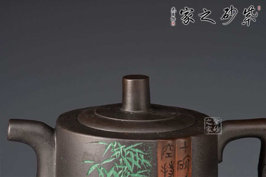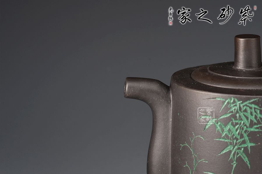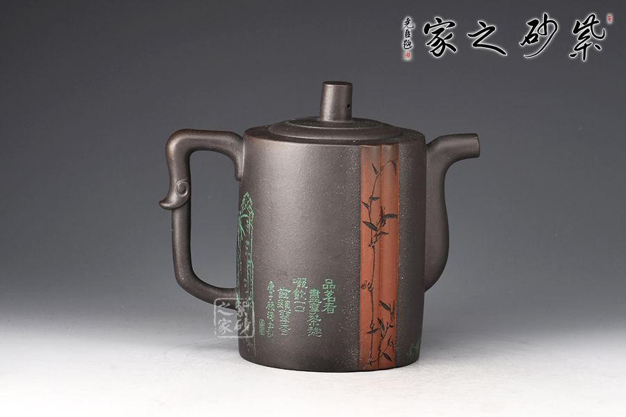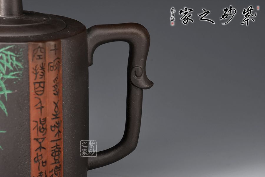 此壺圓身直筒,古樸而穩(wěn)實,嵌蓋嚴(yán)密,天衣無縫,蓋面微凸,圓柱鈕,肩線溫和,彎嘴蜿蜒而出,且流基寬,嘴口圓,出水暢。耳形端把帶飛,端握舒適。壺身雙色泥/刻繪裝飾,整個壺形線條流暢優(yōu)美,品茶欣賞之優(yōu)品。