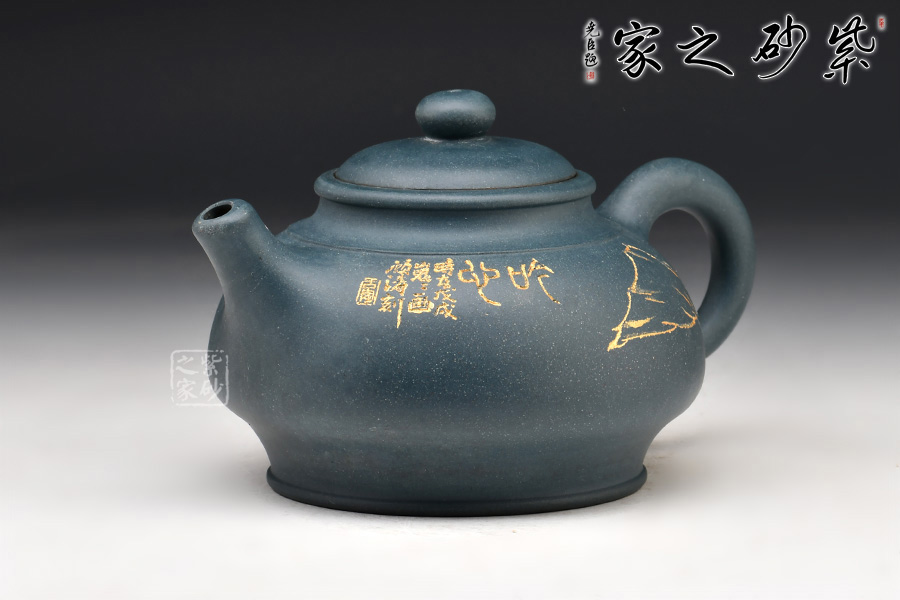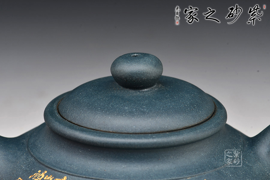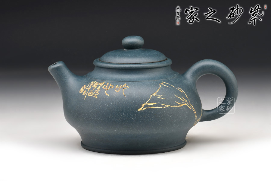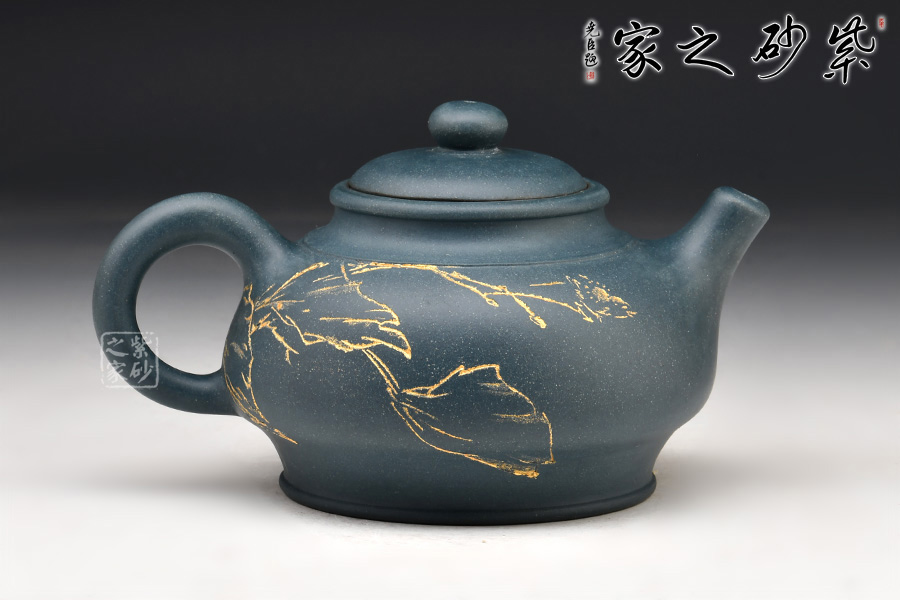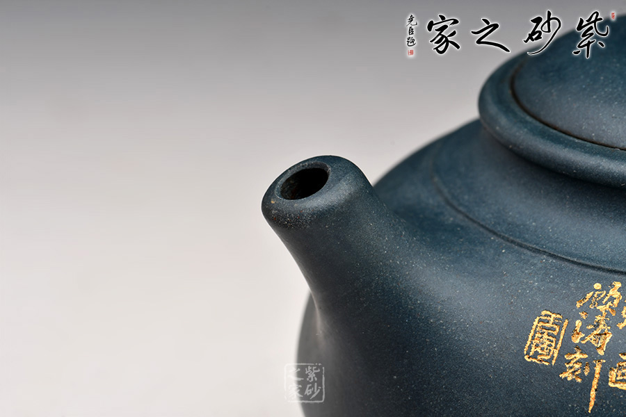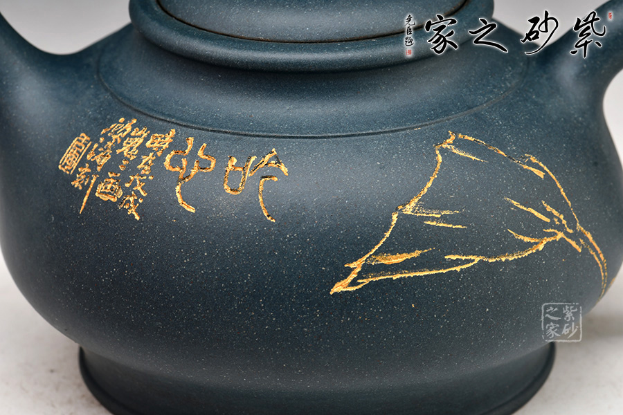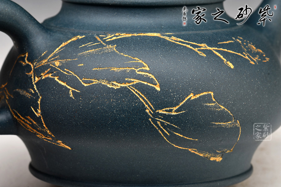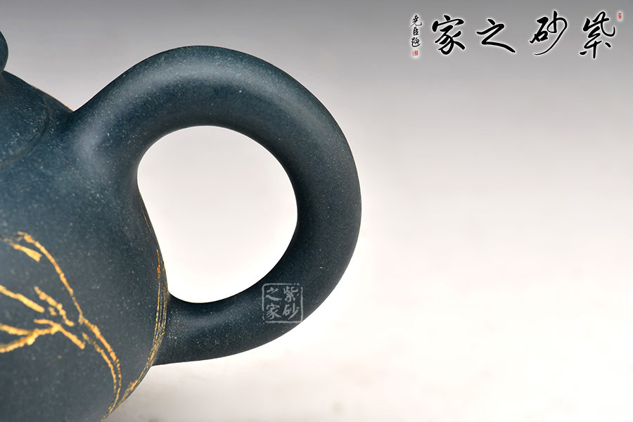 吟心壺成色獨(dú)特,清秀雅致。由壺底蜿蜒向上形成扁圓壺身,高頸敞口,壓蓋設(shè)計(jì),蓋頂大扁圓鈕。沖天直炮嘴,彎曲圓形把。壺身裝飾由金黃色組成,耀眼奪目,頗具風(fēng)韻。
