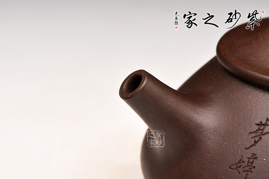 利落的出水是壺身和壺嘴設(shè)計(jì)最為科學(xué)巧妙之處,也是壺友鐘愛(ài)之處。壺身正面題字,背面刻畫(huà)的設(shè)計(jì),對(duì)于廣大壺友而言,是不錯(cuò)的既彰顯自己成熟穩(wěn)重品行,又體現(xiàn)自己深刻文化內(nèi)涵的茶壺。