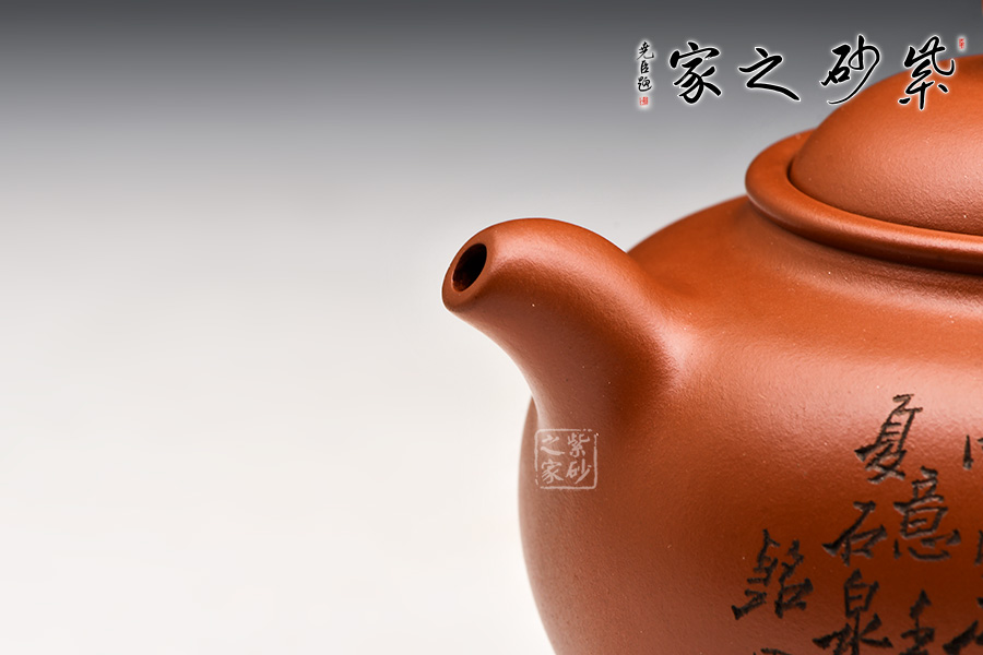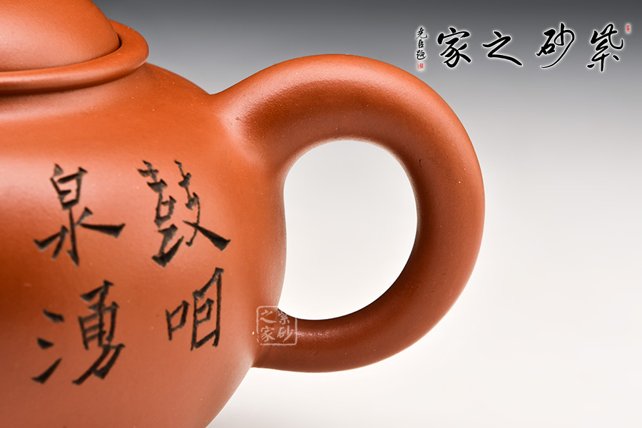 此壺頗有小資情調(diào),給人溫潤如玉的感覺。渾圓的壺身,渾圓的壺鈕,渾圓的線條流暢至極,比例得當(dāng),骨肉亭勻。暗接彎流,柔美之姿明顯,端口下沉,利于出水。壓蓋設(shè)計,似含溫情,氣密性好。彎把跳起后落下,姿態(tài)優(yōu)美,把執(zhí)適手。