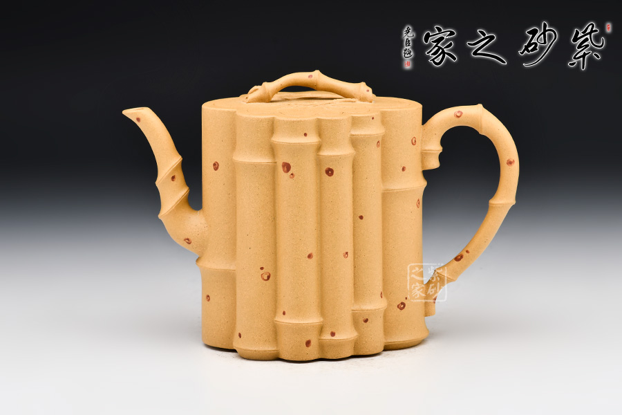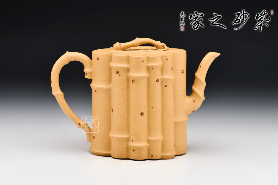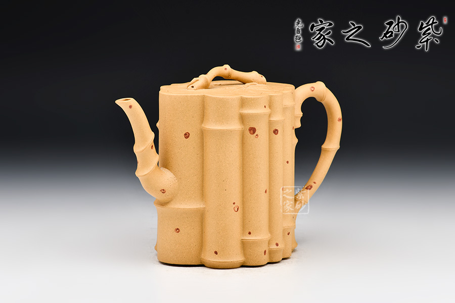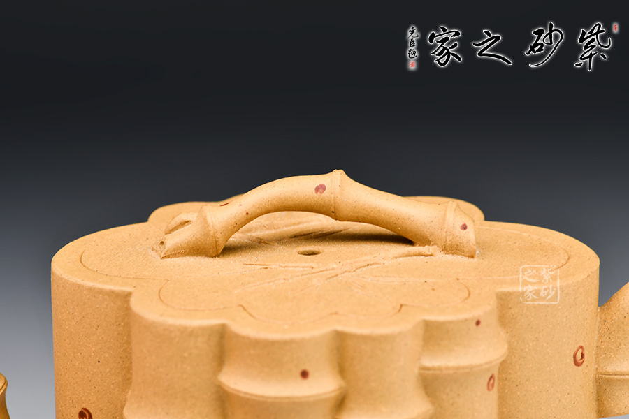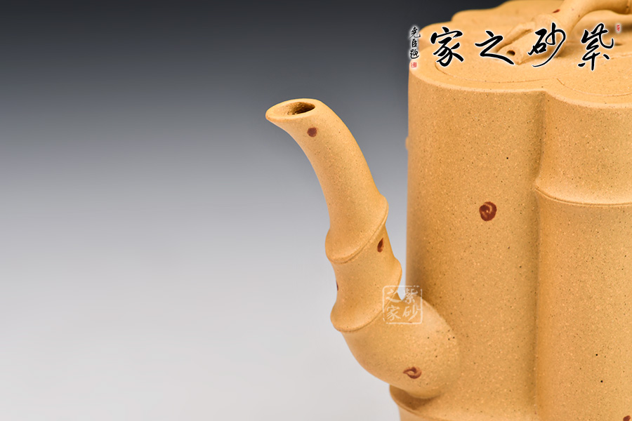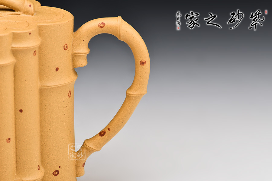 此壺以多根竹竿并攏為筒身,似一捆整齊的竹段,竹節(jié)錯落有致,拼于一體縝密協(xié)調(diào),竹鏤刻細膩入微,造型佳。鈕、流、把均用竹節(jié)題材,肥瘦得體,韻味極佳,整體刻劃精細入微,渾若天成,于平實中見優(yōu)雅,器形像真而悅目。