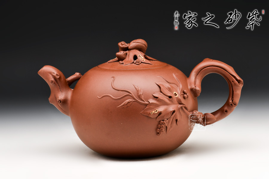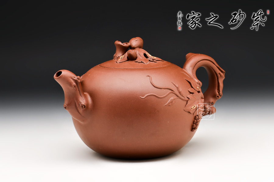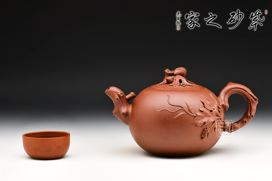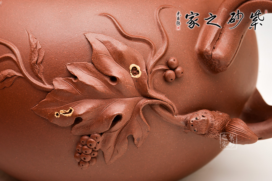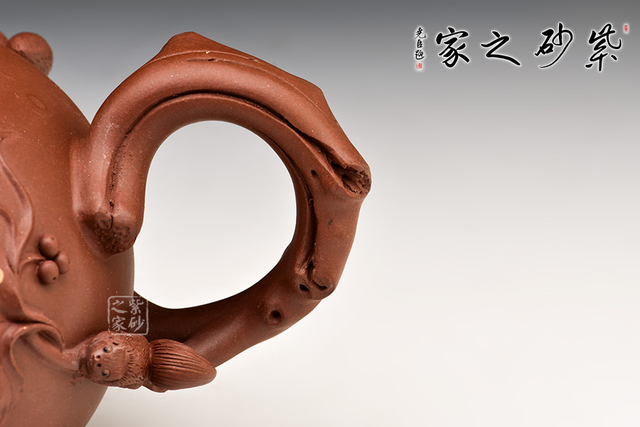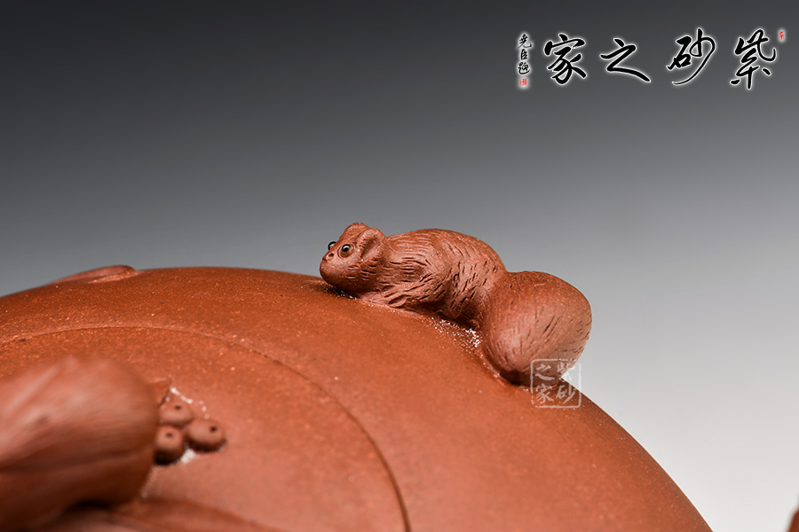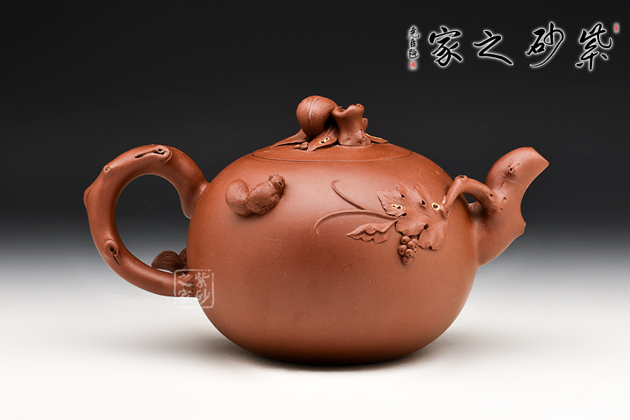 整器飽滿?圓潤。壺嘴、端把為虬曲的葡萄藤,一側(cè)逸出枝?葉,上掛葡萄,各有一只小松鼠來枝下覓食。場景有趣,生動形象。壺鈕也為小松鼠覓食葡萄樣,只不過被掩蓋在葡萄葉和枯藤之下,靈動活潑勁兒展漏無疑。