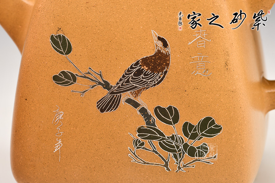 壺身前有美畫“黃鸝站枝頭”,后有文字“春滿玉壺”,充滿了春天生機勃勃的味道,使作品增添無窮的意境和氣韻!