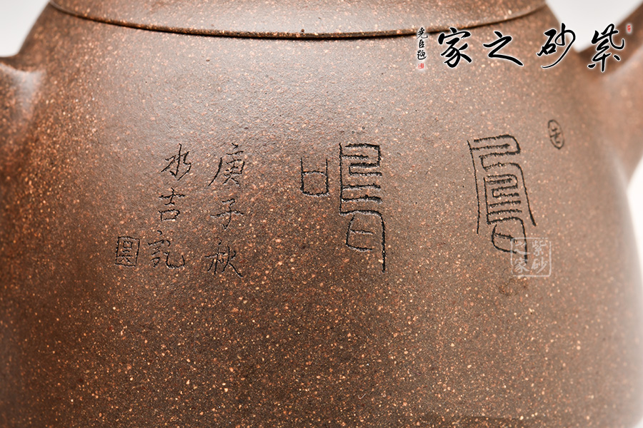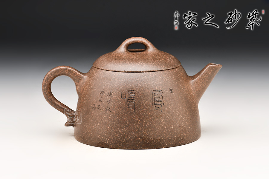 秦權(quán)壺仿秤砣形制,壺身挺拔由下至上收斂,天然流通;直流嘴有勁,環(huán)耳形把手下帶小垂,不矯不揚;平蓋微鼓,沿蓋口形成圓??;鈕似橋頂。