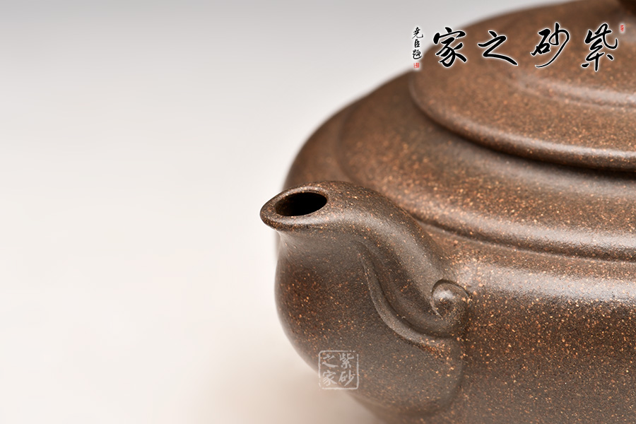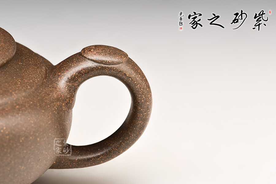 粗大壺嘴兩側(cè)裝飾如意紋路,耳型端把上有一小圓凸出,細(xì)節(jié)處理可見(jiàn)用心。