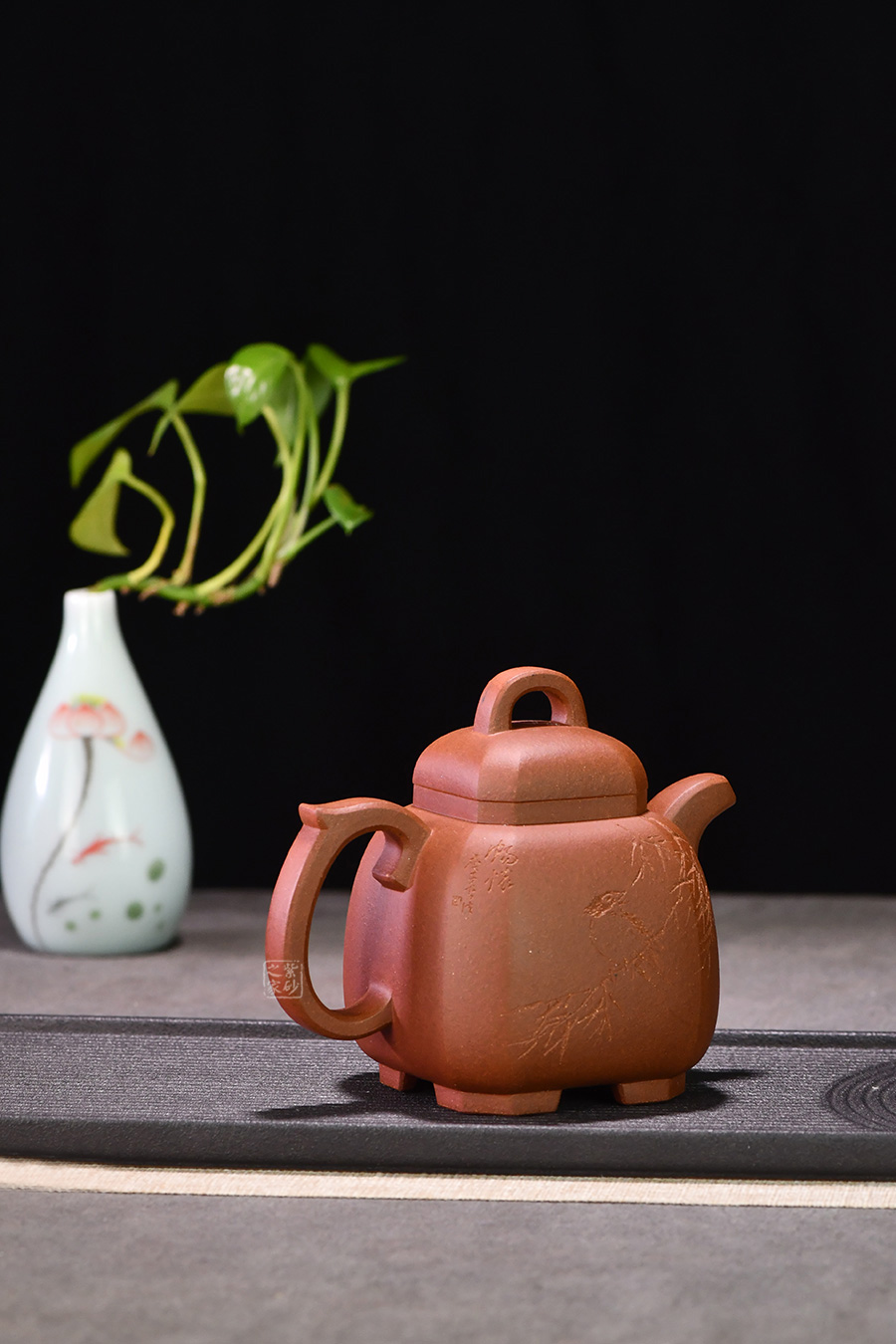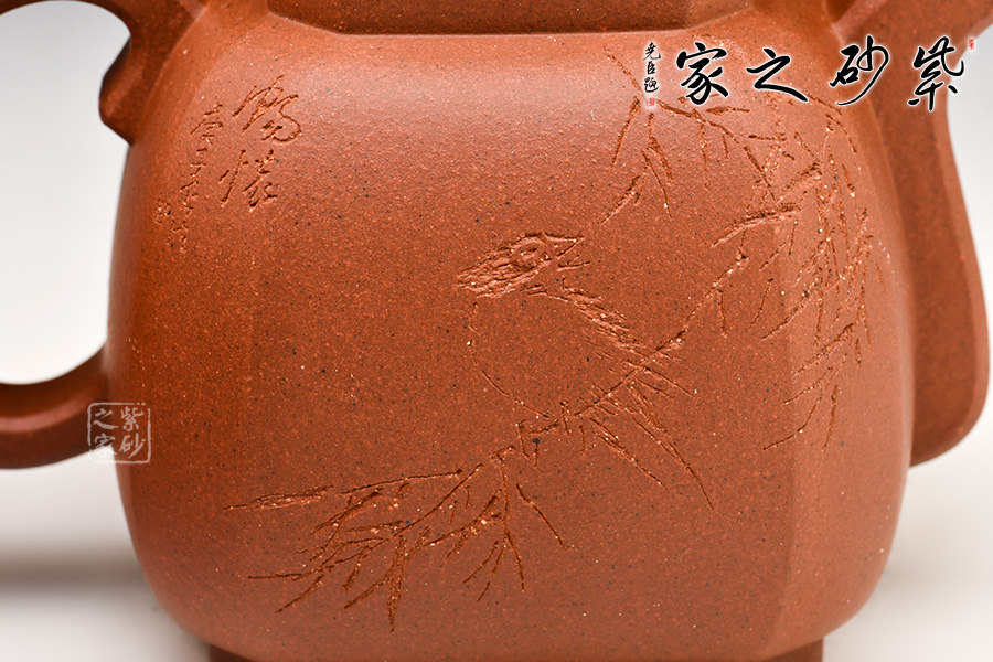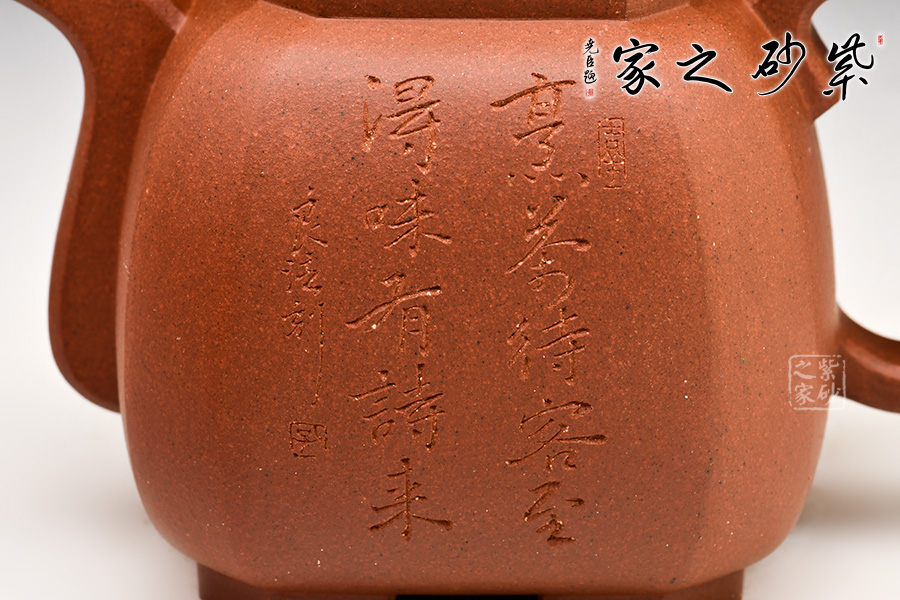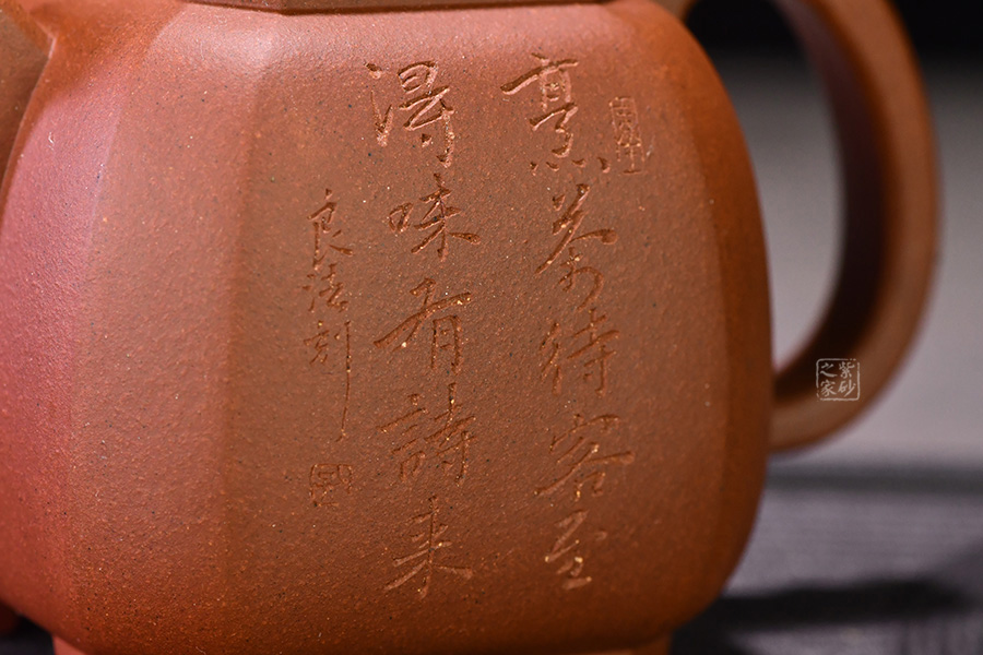 光貨離不開裝飾。俗話說“壺隨字貴,字隨壺傳”:光壺不刻字,就是一把光壺;壺上面刻了大師、名人的字,一把壺的含金量就高了,收藏價值就更高,升值潛力就更大。王福君與中國工藝美術(shù)大師譚泉海合作最多,其次是徐安碧、鮑志強、毛國強(均為中國工藝美術(shù)大師、中國陶瓷藝術(shù)大師)。