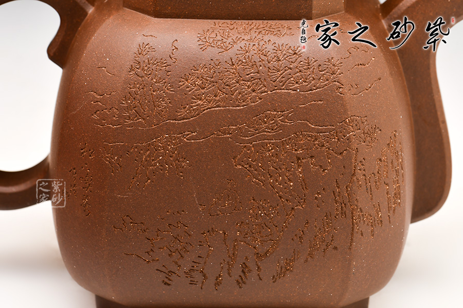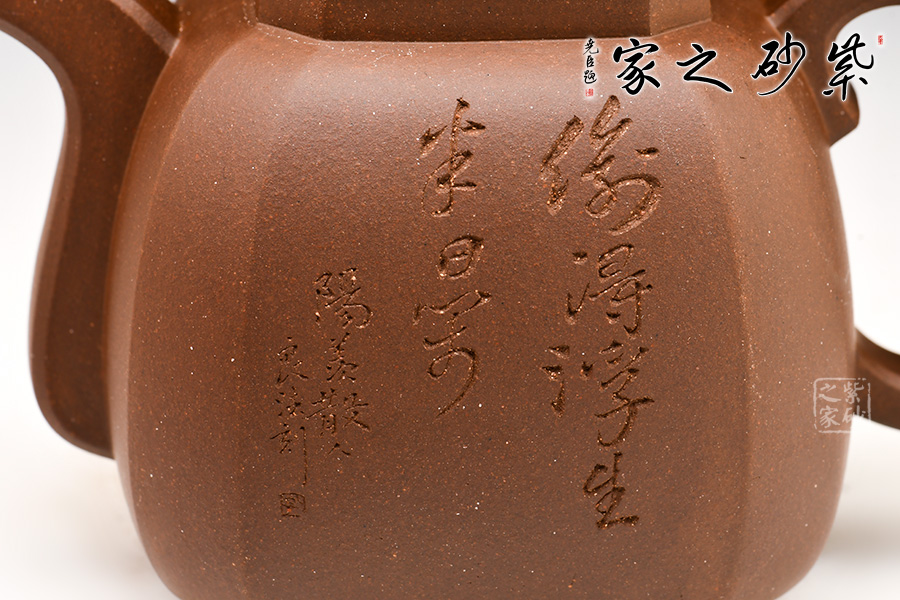 光貨離不開裝飾。俗話說(shuō)“壺隨字貴,字隨壺傳”:光壺不刻字,就是一把光壺;壺上面刻了大師、名人的字,一把壺的含金量就高了,收藏價(jià)值就更高,升值潛力就更大。王福君與中國(guó)工藝美術(shù)大師譚泉海合作最多,其次是徐安碧、鮑志強(qiáng)、毛國(guó)強(qiáng)(均為中國(guó)工藝美術(shù)大師、中國(guó)陶瓷藝術(shù)大師)。