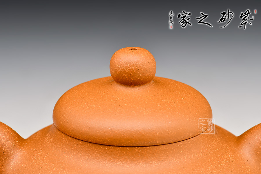 壺身為扁圓,肩線和足線上下對(duì)應(yīng)。圈足,滑肩,平蓋設(shè)計(jì),對(duì)接工整。鼓蓋簡(jiǎn)潔流暢,珠型鈕碩大精巧。壺把和壺嘴的造型都很傳統(tǒng),壺把環(huán)形,渾圓厚重,壺嘴彎流,線條簡(jiǎn)單。