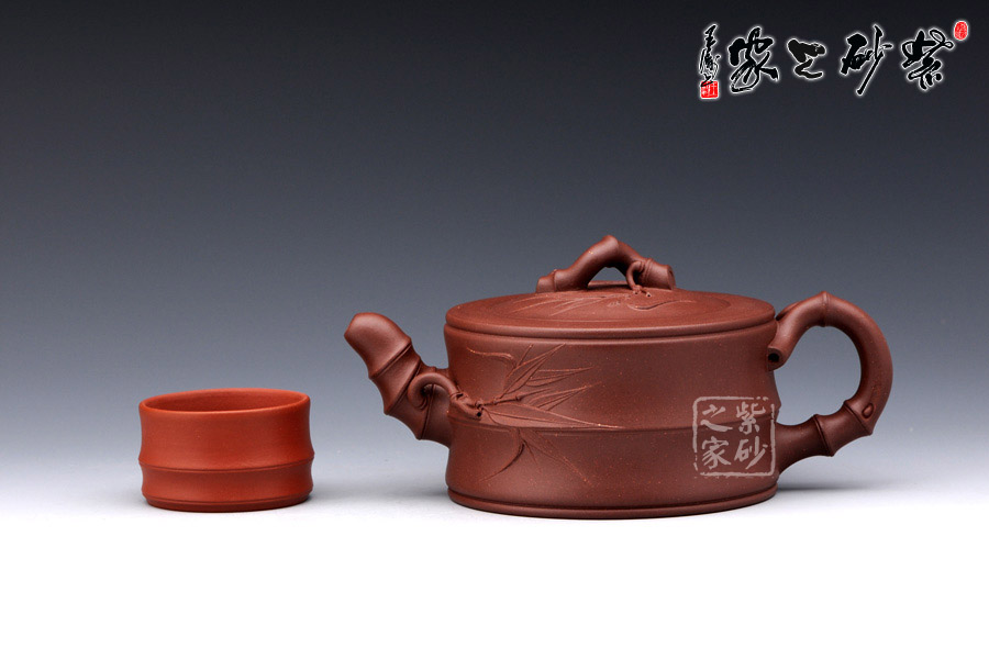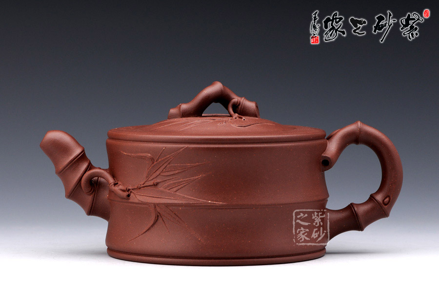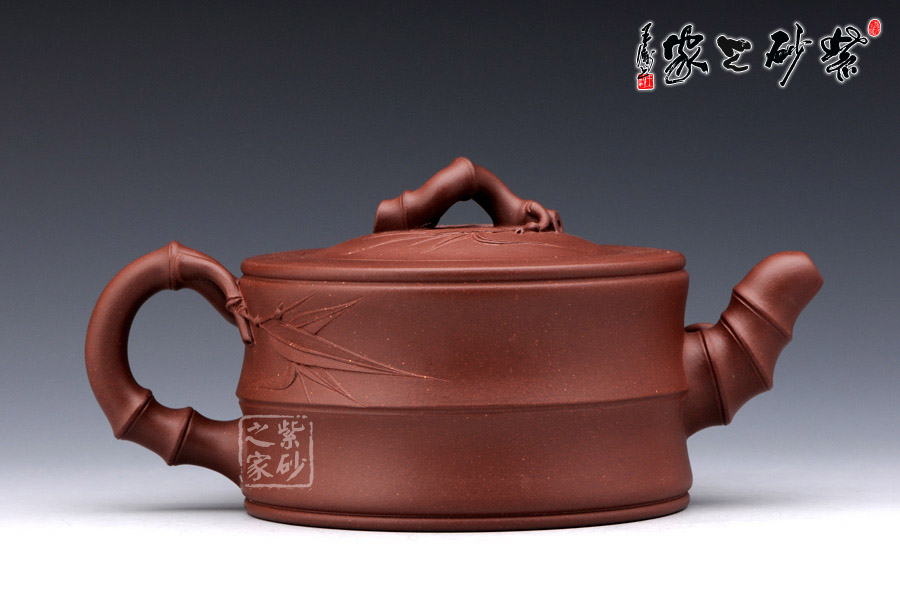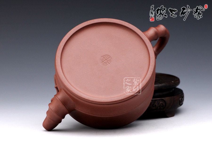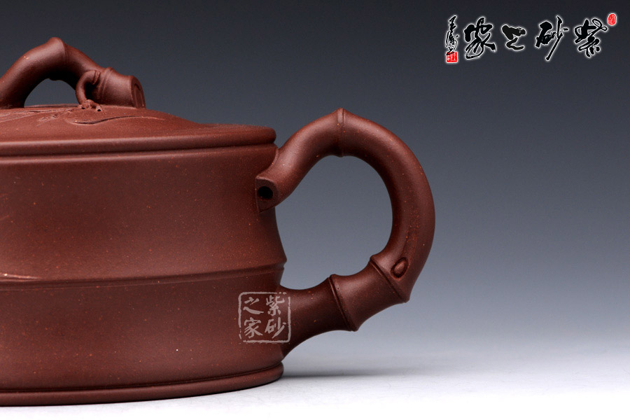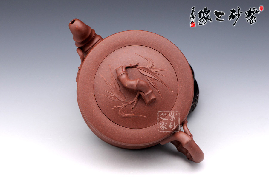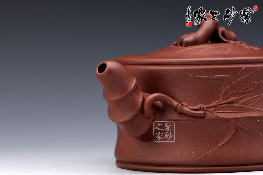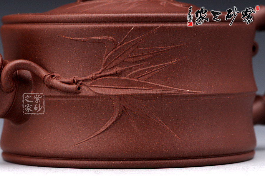 壺身為直筒形狀,壺腹中間與底部都有勒線凹進(jìn),使得身筒形似竹節(jié)狀,清新閑趣頓然生出。壺嘴用小竹節(jié)節(jié)節(jié)伸出,一種寓意節(jié)節(jié)升高的感覺。壺柄,下端為整節(jié)連著壺身,到上端分開為兩股貼合在壺身上,自然而又美觀。做成壺鈕的竹節(jié)上帶有幾片竹葉,做飄動狀,似乎在隨著風(fēng)在壺頂搖曳。整個壺看上去到處充滿著靈氣,竹葉飄動,竹枝挺立,魅力非常。貼竹葉和貼竹子都很多,制作復(fù)雜,嵌蓋,嚴(yán)密 氣密性好。家藏老底槽青,很好泡養(yǎng)。
