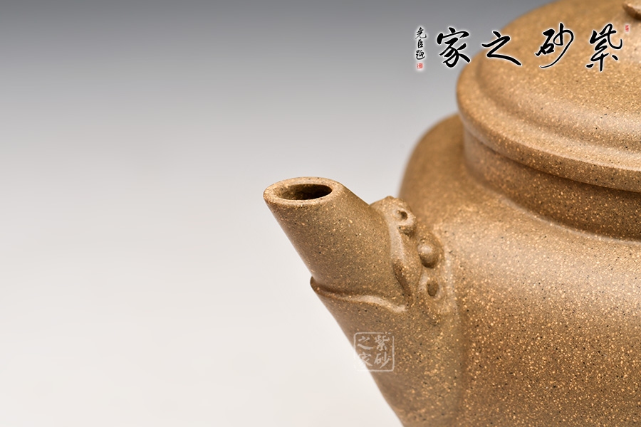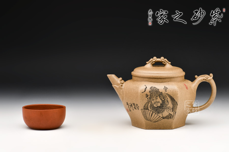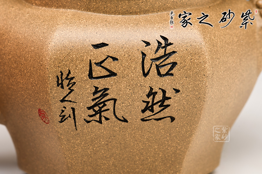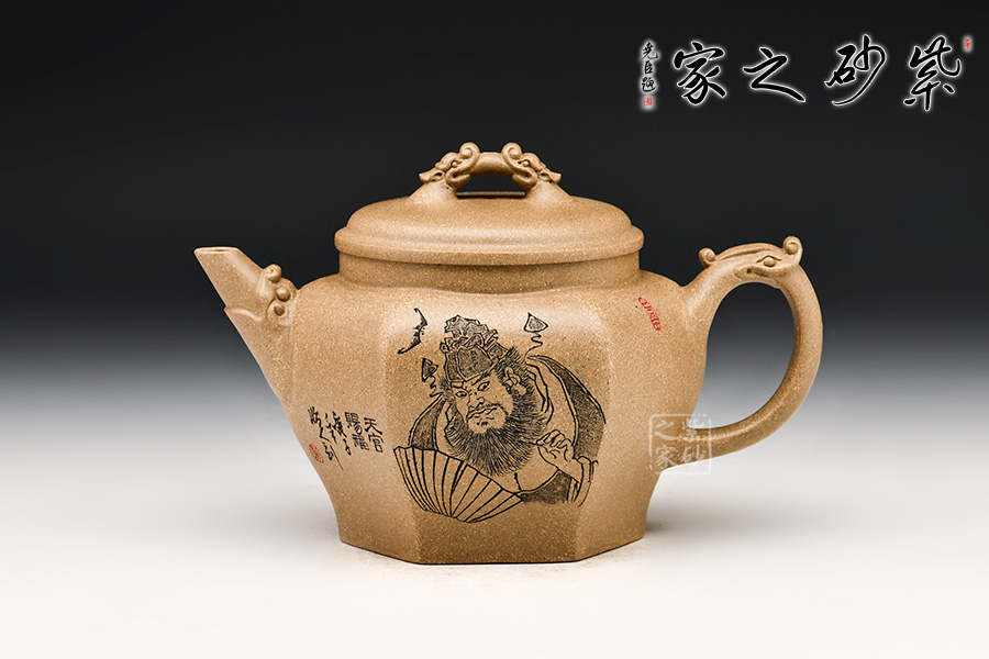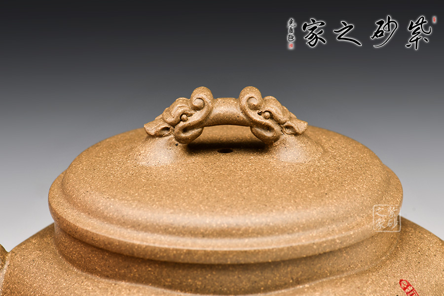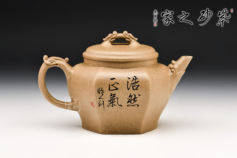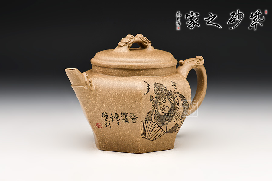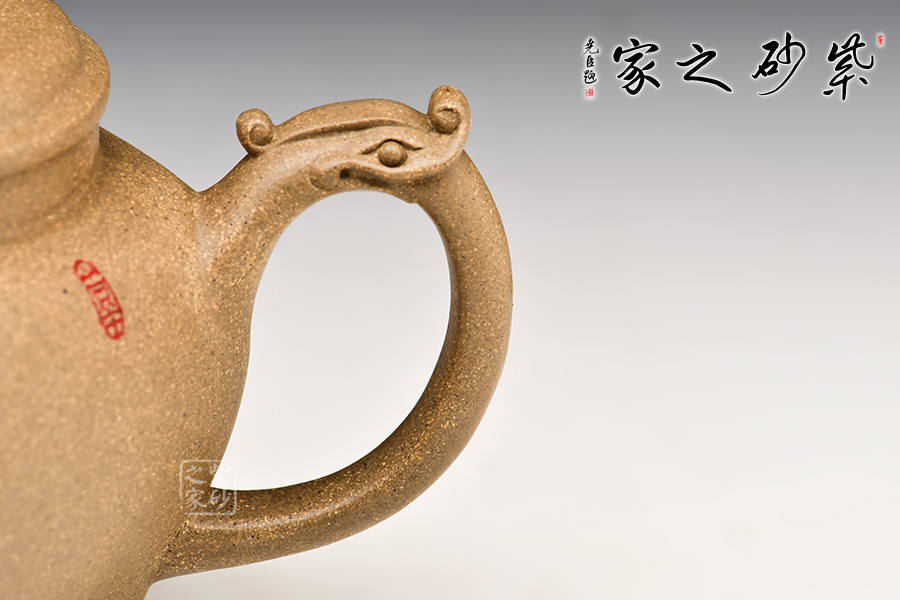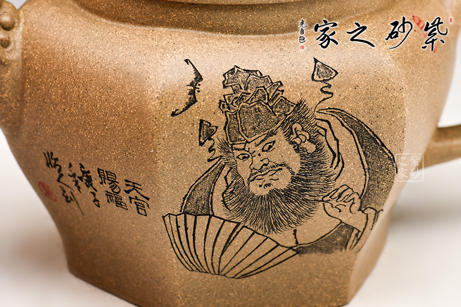 此壺是六方宮燈壺的創(chuàng)新器型。宮燈壺是紫砂壺中的經(jīng)典。宮燈,顧名思議是指古代宮廷用燈,紫砂以其為原型,不僅因其造型美觀,更取其奢華富貴、興隆和吉祥之意。此宮燈壺以六方呈現(xiàn),線條順滑,造型別致,對于做工要求極高。而此壺的六方接近,輪廓清晰,線條鮮明有力,比例協(xié)調(diào),對稱工整,整把壺看起來雍容典雅。壺鈕壺把壺流均裝飾靈龍造型,諧音玲瓏,點題壺名,刻繪天官賜福畫像,福氣滿滿。