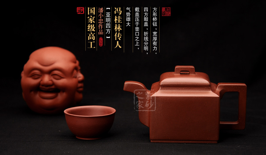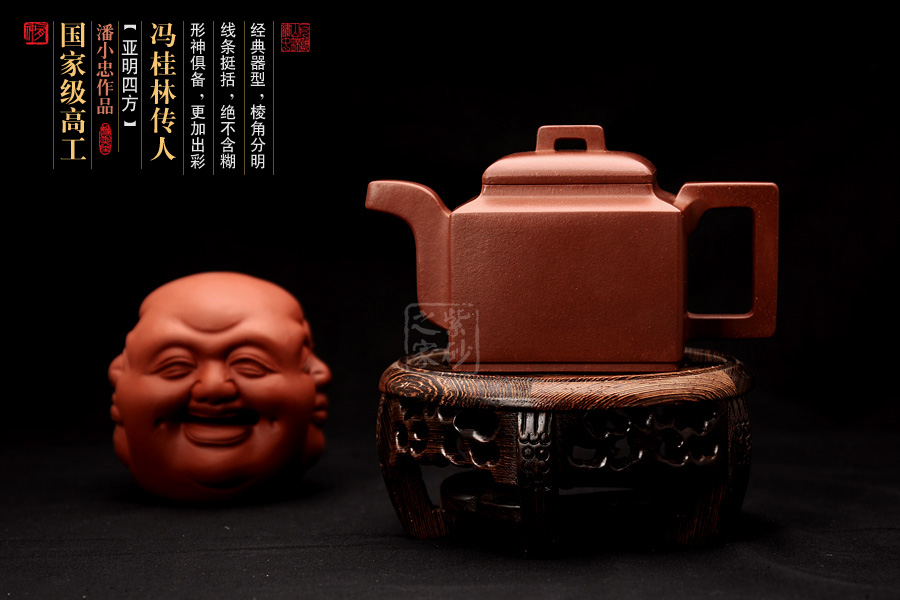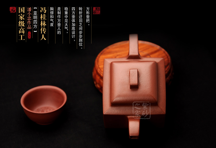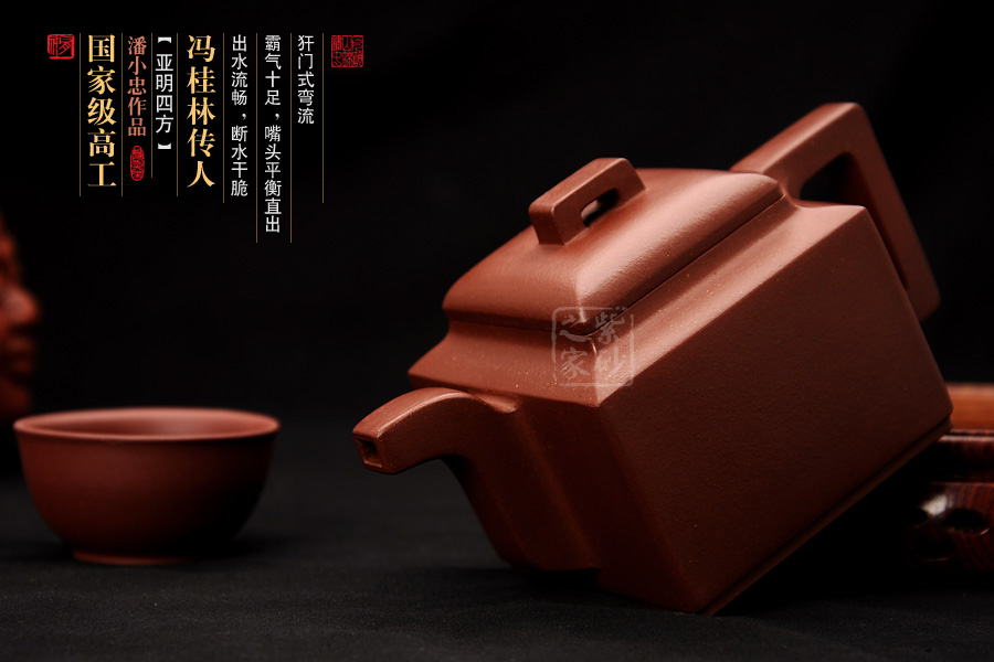 潘小忠老師的方壺一向棱角分明,線條挺括,絕不含糊。這款亞明四方雖為經(jīng)典器型,然而在潘老師手中形神俱備,更加出彩!方形橋鈕,寬厚有力。四方鼓蓋,折線分明,截蓋壓于壺口之上,氣勢雄大。