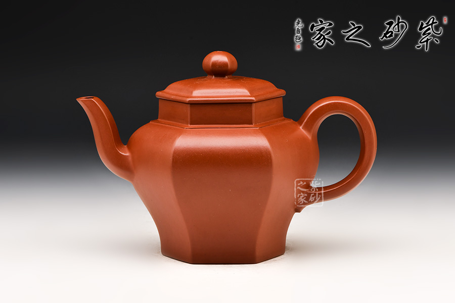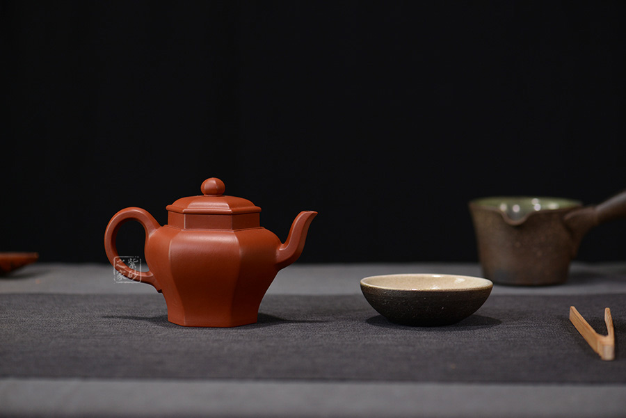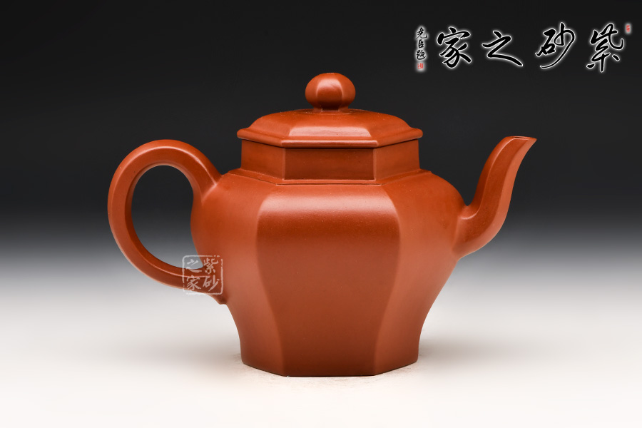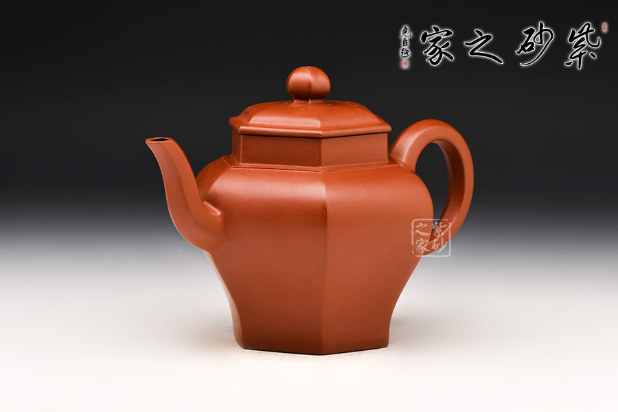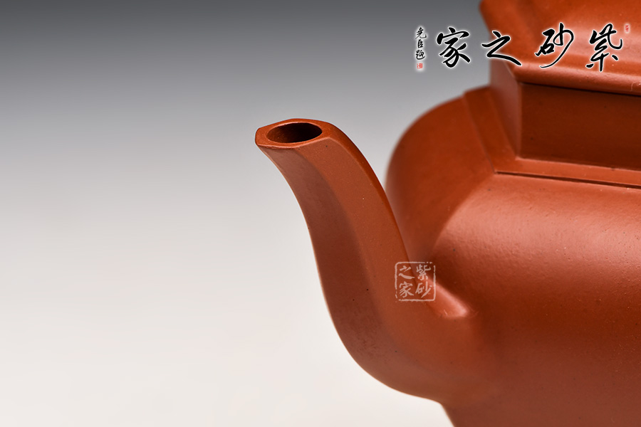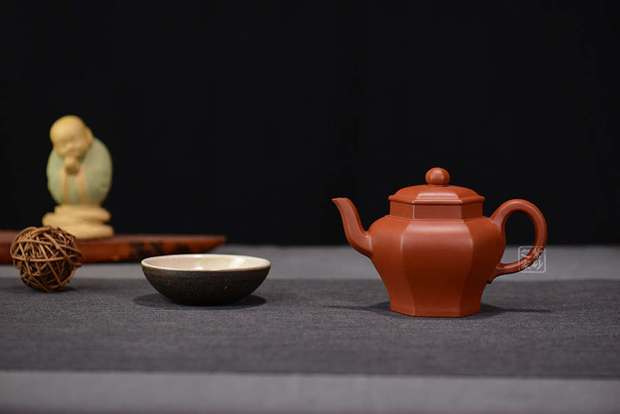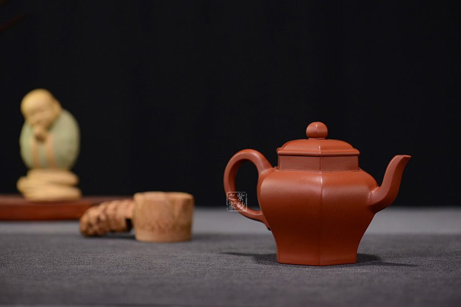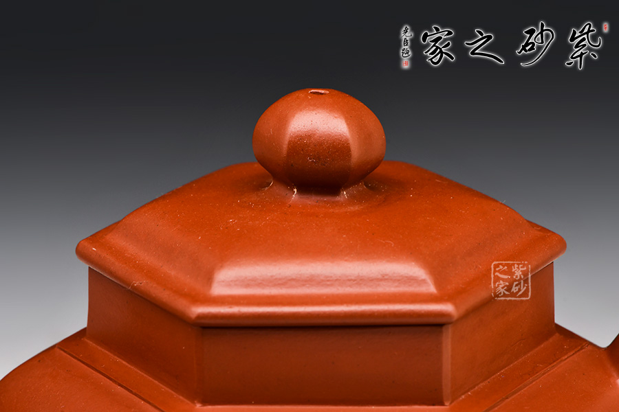 壺體高挺有力,整體似一只古雅的宮燈惟妙惟肖:壺身由六面組合而成,削肩、高頸、肩部鼓出,突顯張力;壺身由肩部向下內(nèi)斂、平底穩(wěn)健、線條蔓延并貫穿于整個壺身;壺口與壺蓋均呈六方形,上下劃一、對稱一致,任意轉動方向均可對齊。與此同時,壺體各部位也做到與主體的對應:三彎流、大耳把 、珠形鈕均設計成六方形,相應相稱,充分演繹出六方器型的高遠風范 。