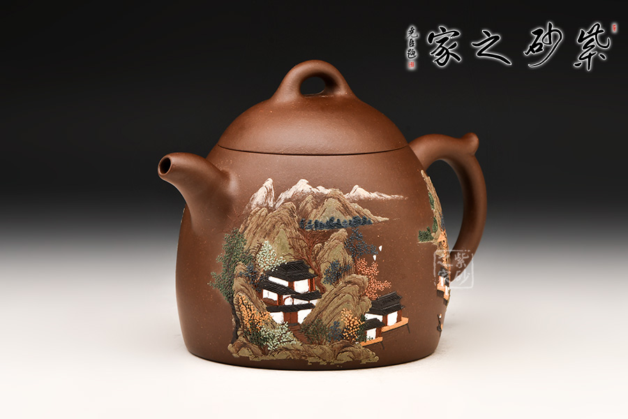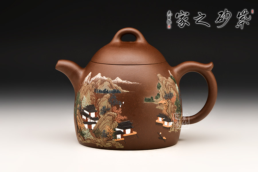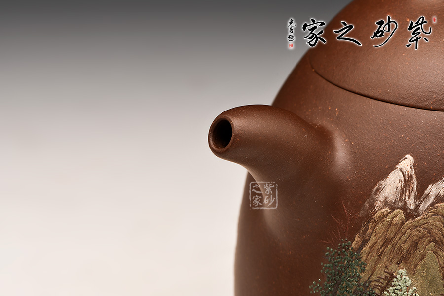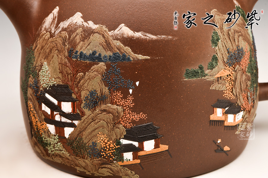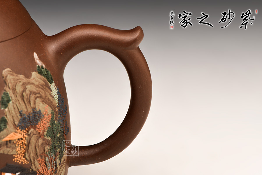 壺身正面彩繪山水人家美圖,后面刻詩(shī)句,意境空曠,韻味雋永悠長(zhǎng)。