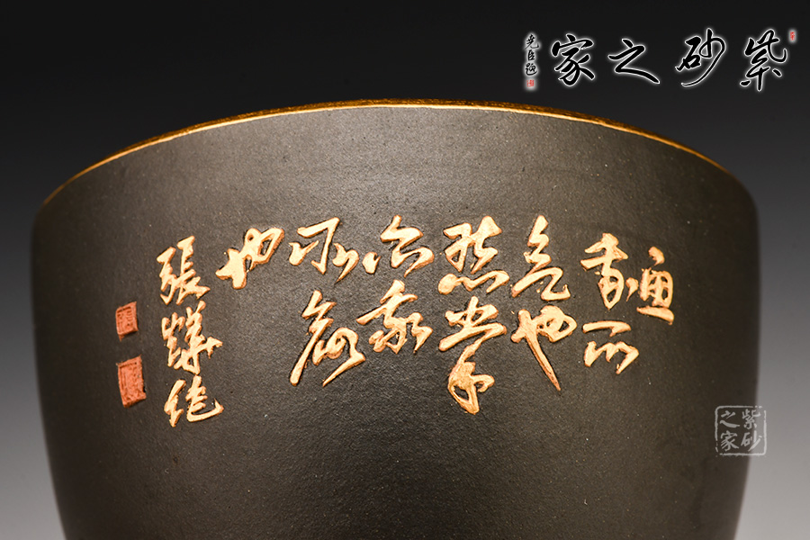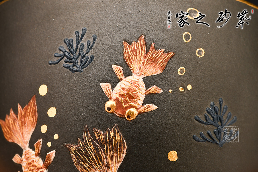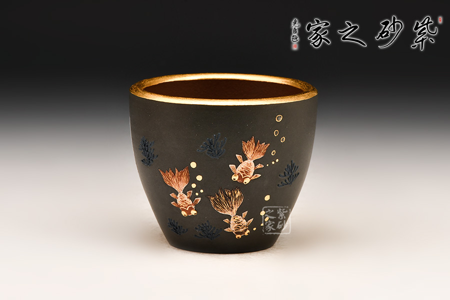 杯身前采用彩繪裝飾工藝,繪制了在一片深紫色水草中,三條正在悠閑游玩,口吐泡泡的金魚,形態(tài)各異,歡暢無比,意趣無窮。杯身后刻金色詩文,色彩奪目,增添風(fēng)采。