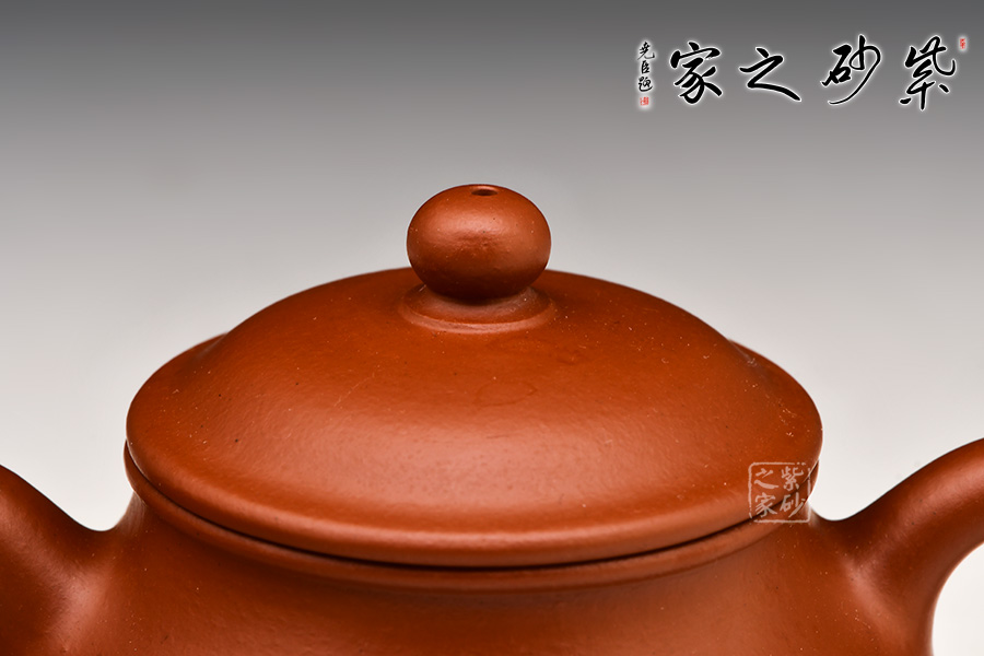 壺腹如鼓,向外擴(kuò)張,向下急收至圈足底盤。肩部緩緩向上收縮,圓弧口與壺蓋吻合,唇邊厚實(shí)。壺蓋隆起,圓形壺鈕如明珠鑲嵌正中。一彎嘴,耳型端把帶下垂。