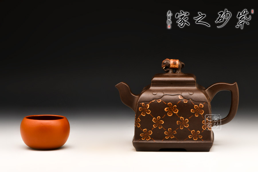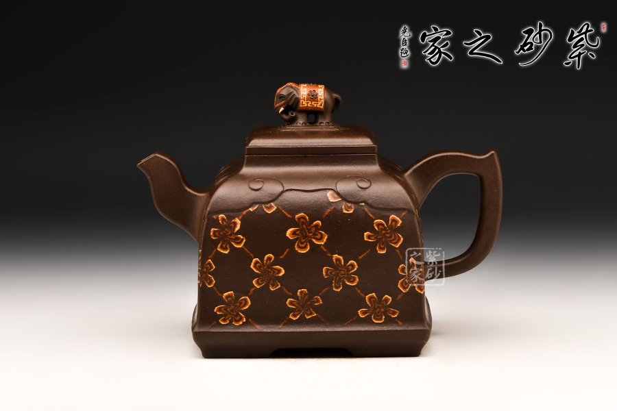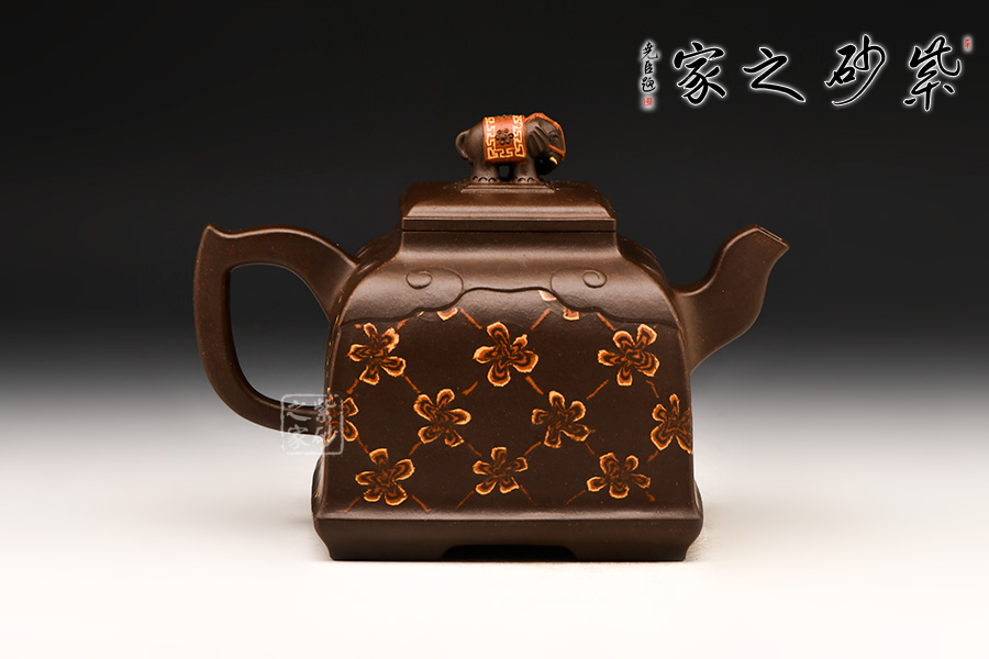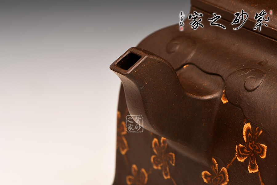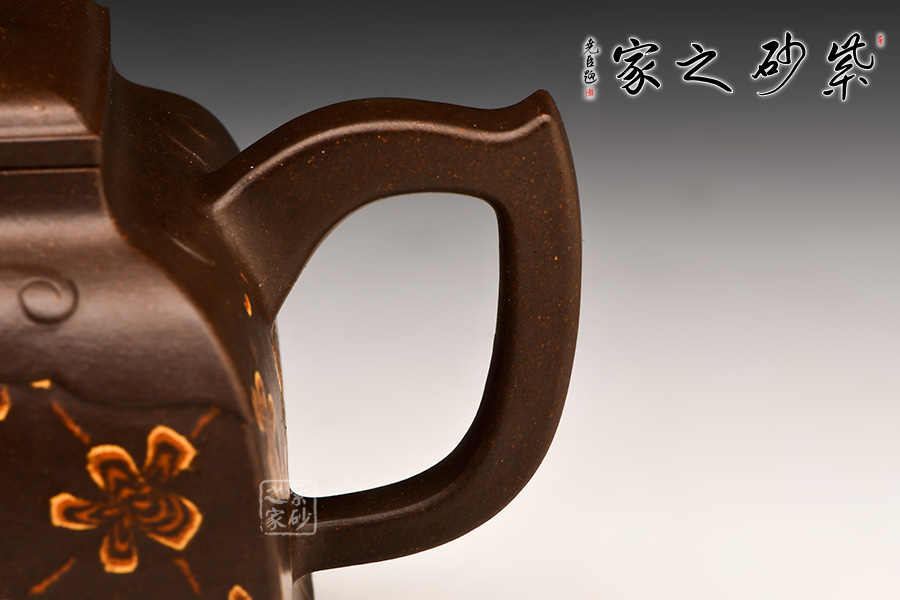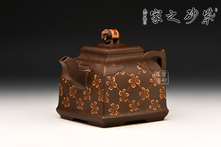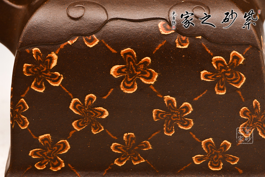四方壺身采用獨(dú)特的絞泥裝飾工藝手法,在器身裝飾形態(tài)優(yōu)美的花朵,線條挺括,棱角分明,極大的增加了紫砂壺的視覺美感。